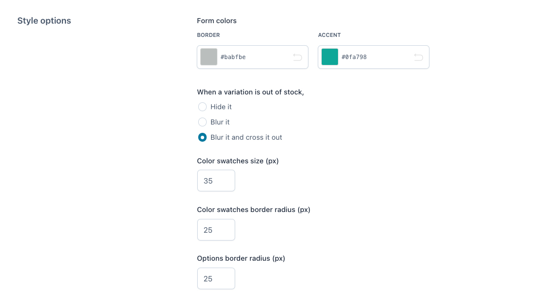 When a product variation is out of stock, you can choose to either hide it, blur it, or blur it and cross it out. You can configure this from the Customization options.