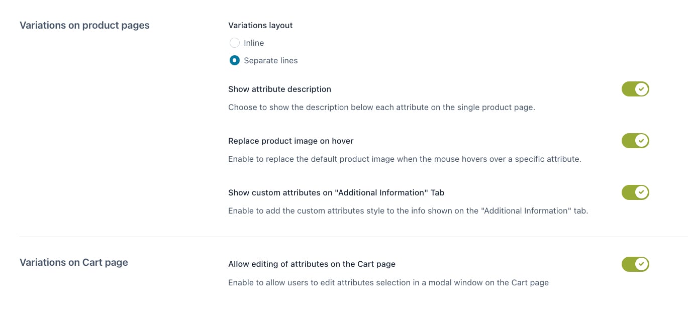 • replace the WooCommerce variations selector with a functional and modern design;