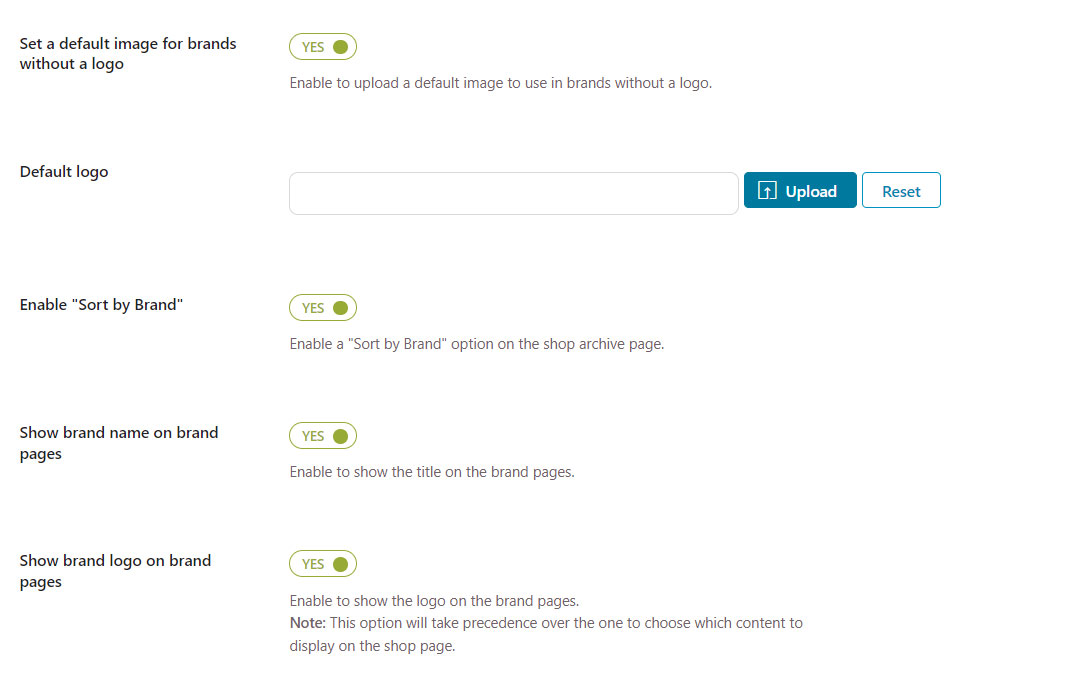 The plugin allows you to easily create unlimited brands. For each brand, you can enter the name, customize the slug, and upload a custom image/logo. You can choose to show only the name, only the logo, or both on the product page and shop pages.