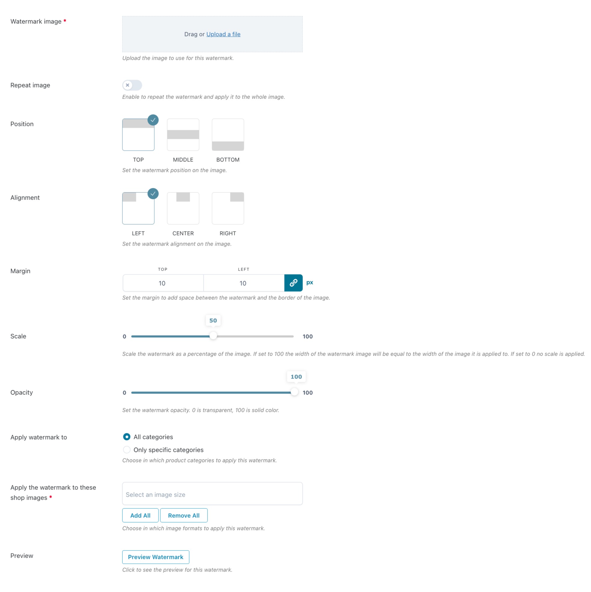 Do you want to show the watermark only on the product page and hide it in the shop page and thumbnails? Or maybe you want to show the logo only when the user clicks on the image zoom? Choose the format to apply the logo to or select “All” to apply it to all images.