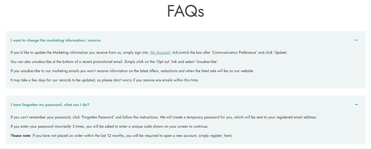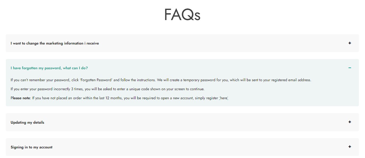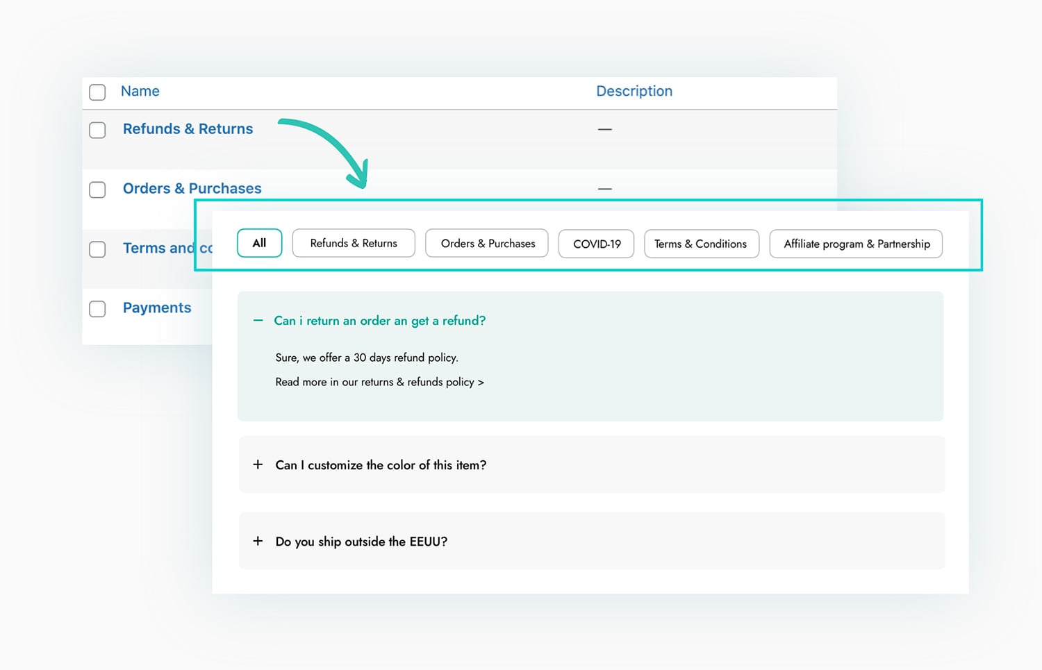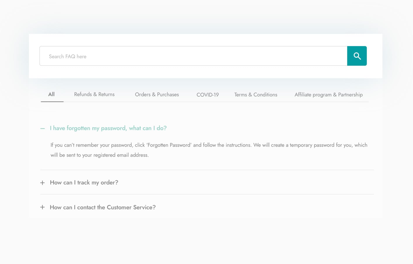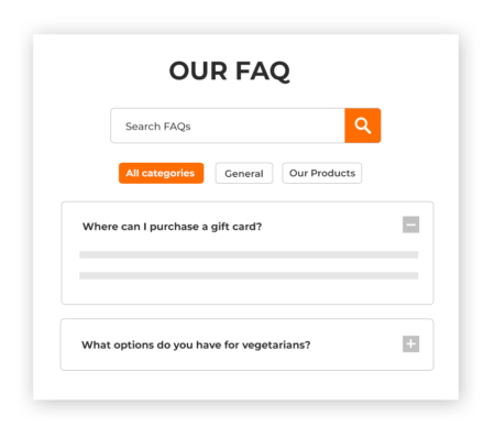 Do you have too many FAQs to display and want to make sure this page is user-friendly? Group your questions into categories (e.g. “Orders”, “Shipping”, “Returns & Refunds”, etc.) and let users filter the questions (in AJAX) based on the topic and category they are interested in.