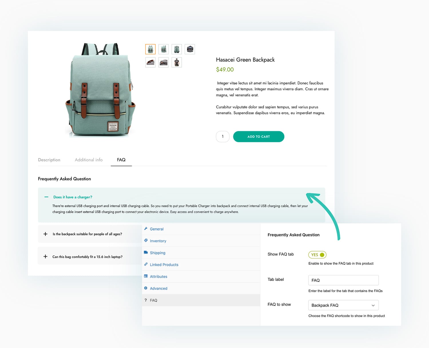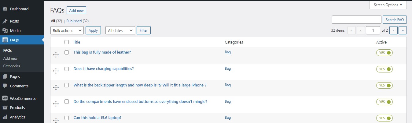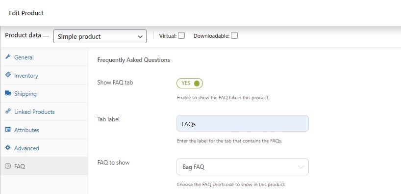 Since version 2.0, the plugin fully supports WooCommerce, so you will be able to configure specific FAQ sets on your product pages. On the product page, you will see an additional FAQ tab – listed among the default WooCommerce ones – where you can display the most frequently asked questions about your products to clear your customers’ pre-sales doubts in real time.