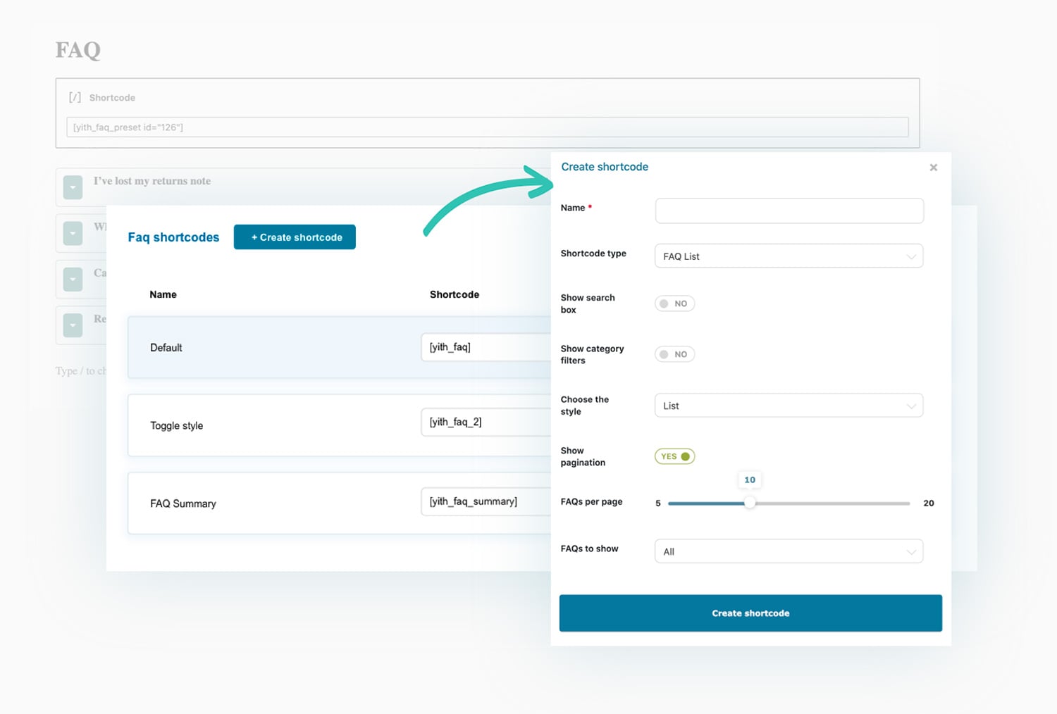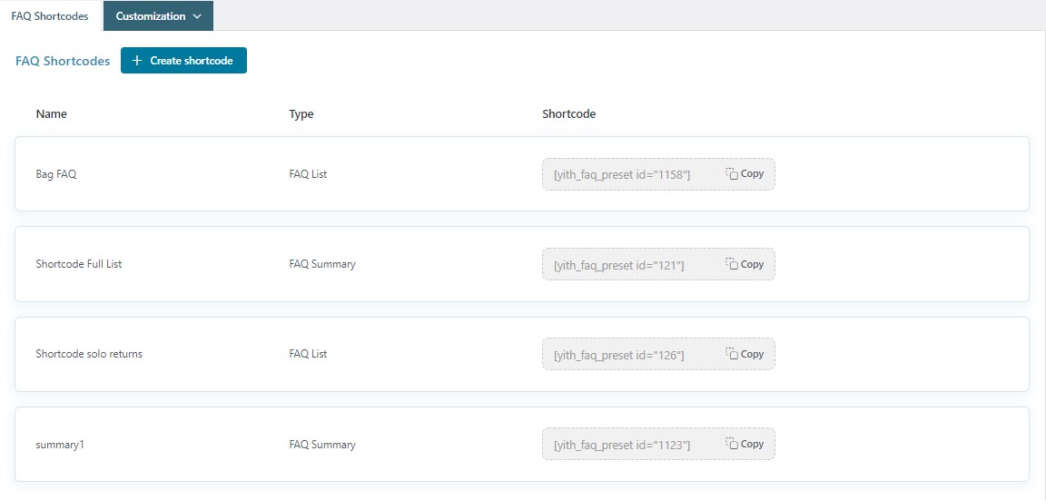 Once you create the questions, you can generate unlimited “shortcodes” or Gutenberg blocks to display specific questions on your shop pages. You can add them to a specific FAQ page, into the footer, in a sidebar, or any other widget area. When you create the shortcode, you can customize the style, choose how many and which questions to show, and much more.