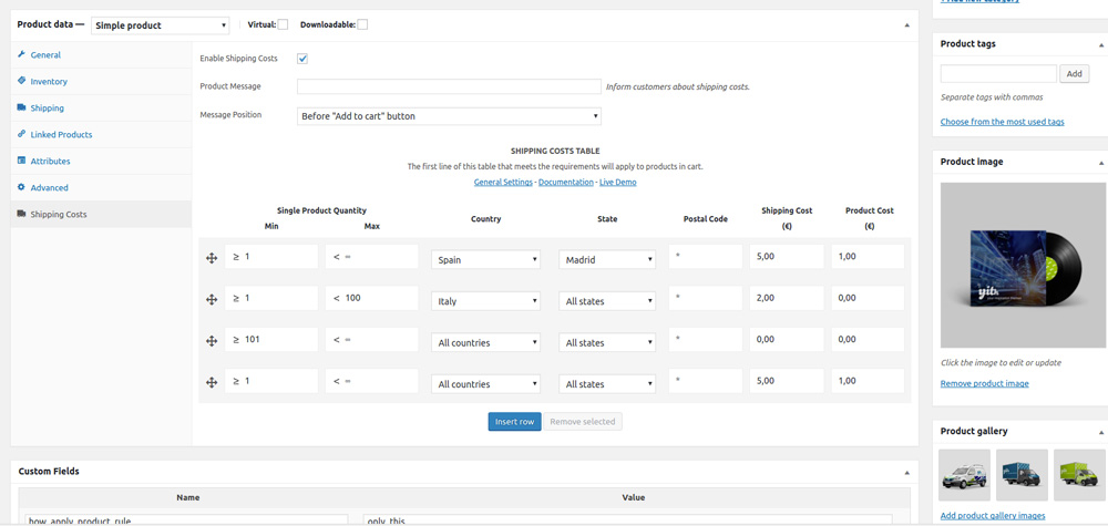 What the plugin does Handle different shipping costs by single product of your store, so for example you can set different fees for each state, region or city.