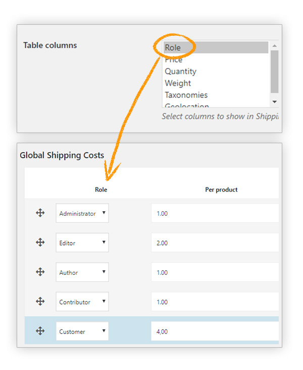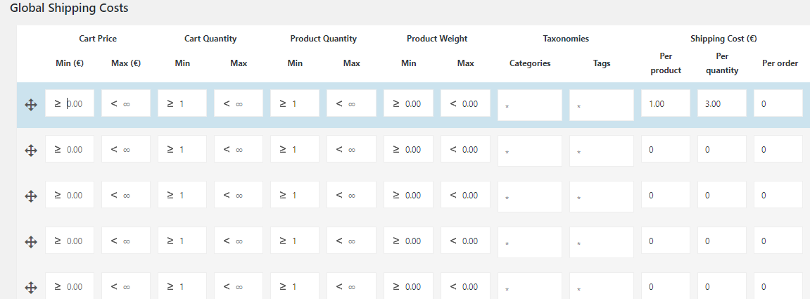 Drag and drop shipping costs rule