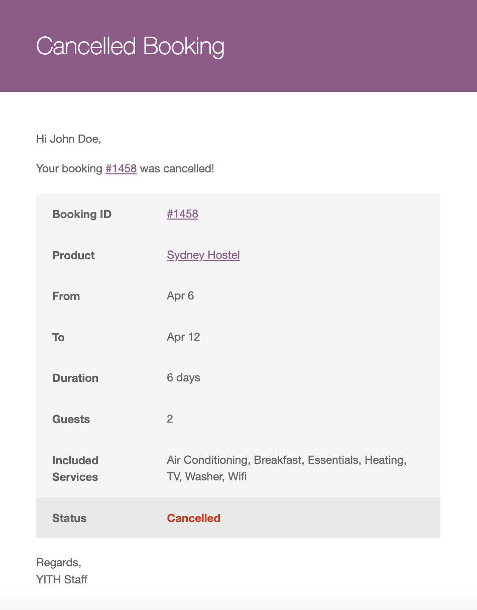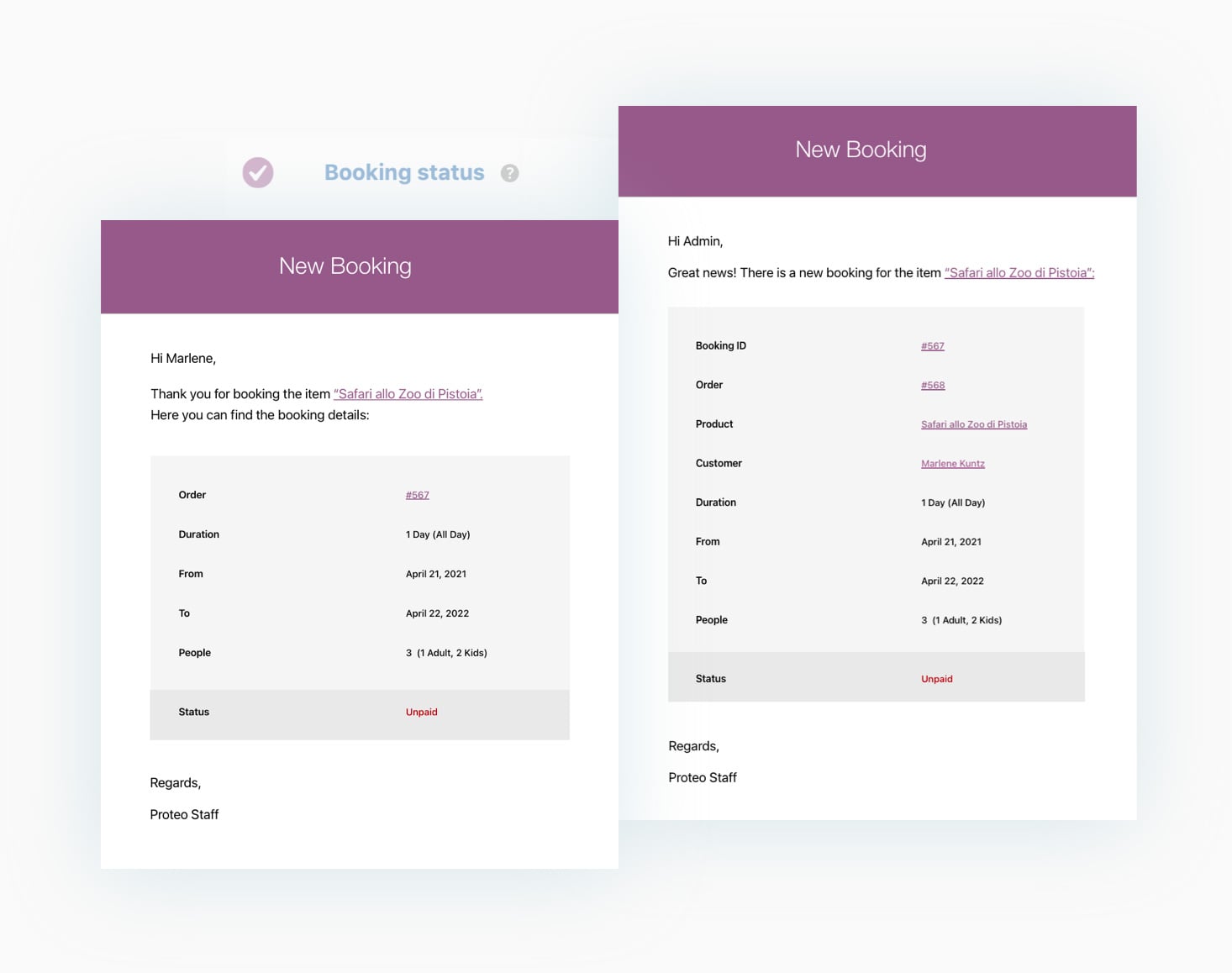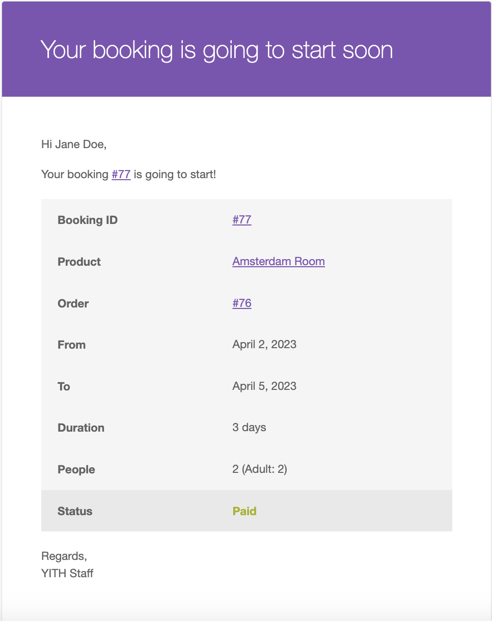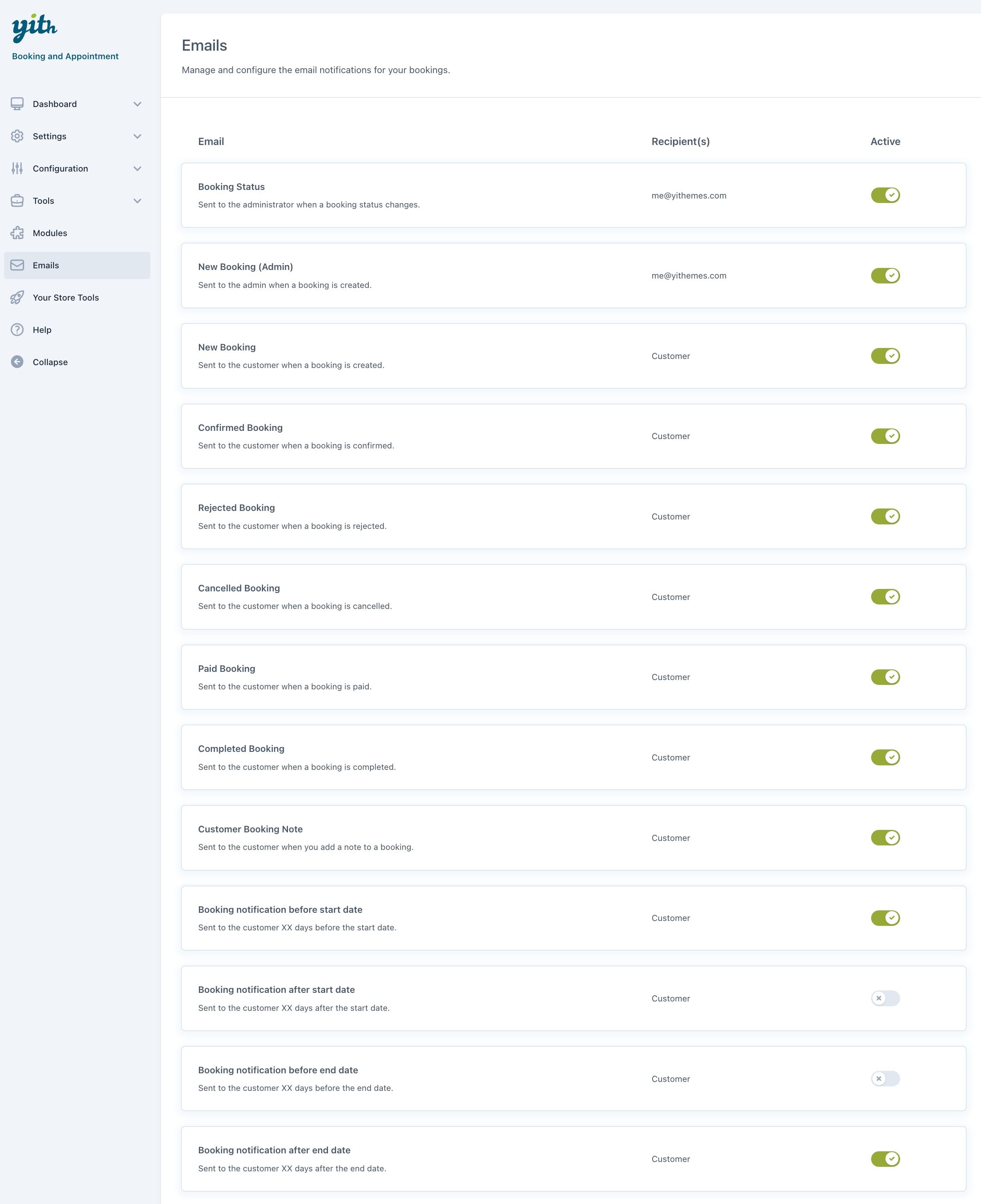 Stay up-to-date about everything occurring in your shop; the plugin sends automatic notifications both to the admin and customer every time a booking is created, edited, or canceled, whenever the booking status changes and the payment is confirmed. You will also be able to send custom emails before the booking starts and after it ends, deciding in both cases when to send them (for example, an email will be sent one week before the booking starts and the other email will be sent three days after the booking is completed).