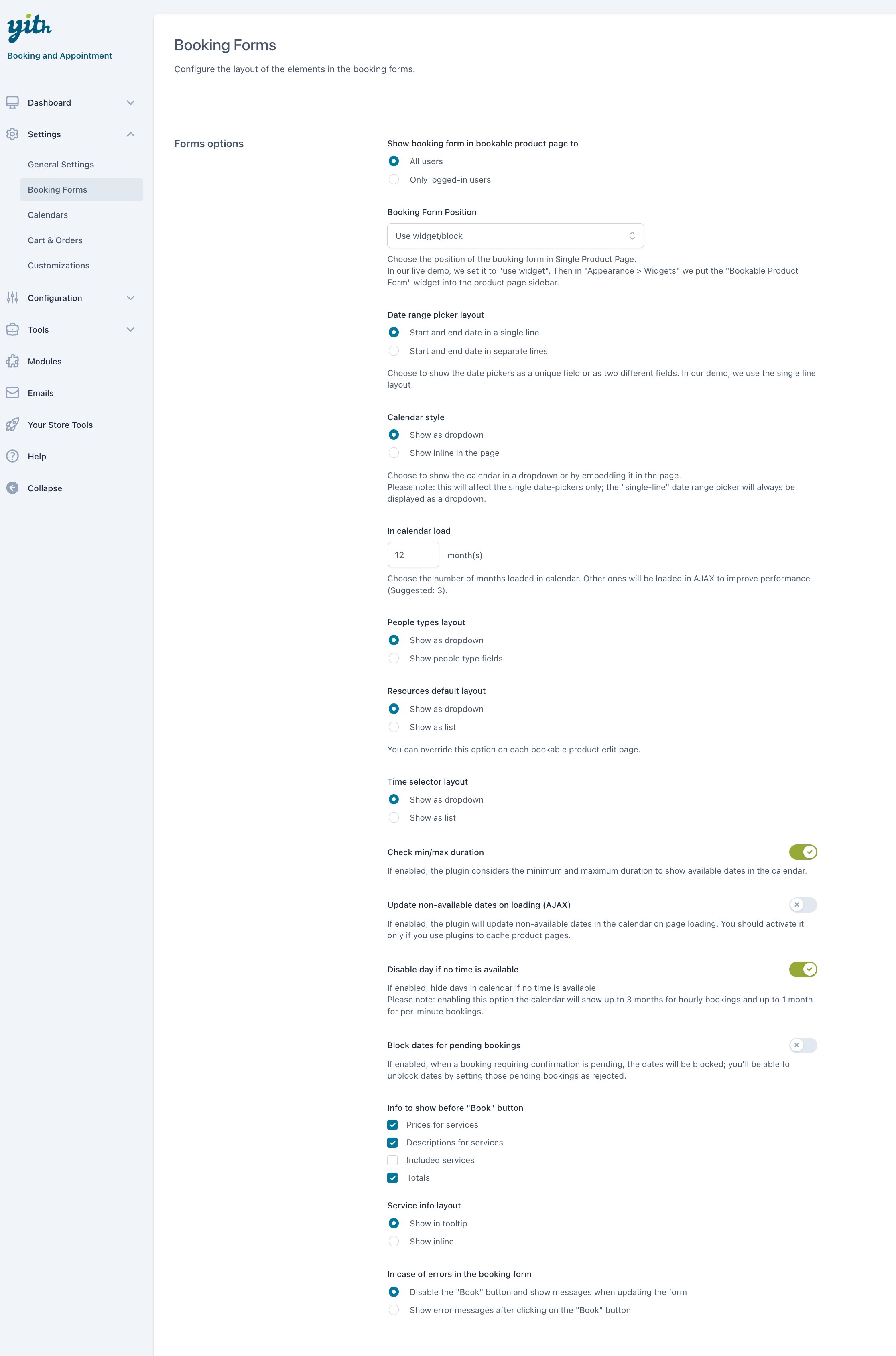 Booking needs change based on the service or product; you can choose to accept only weekly or monthly bookings for apartments and, at the same time, hourly bookings for a counseling service, a therapist, or your personal training session. When creating a booking product, you can define the type of booking and customize the duration, price, maximum number of bookings accepted, and so on. You can accept bookings automatically or set them with the “pending” status and approve them manually. Additionally, you can decide whether to let the user cancel the booking or not.