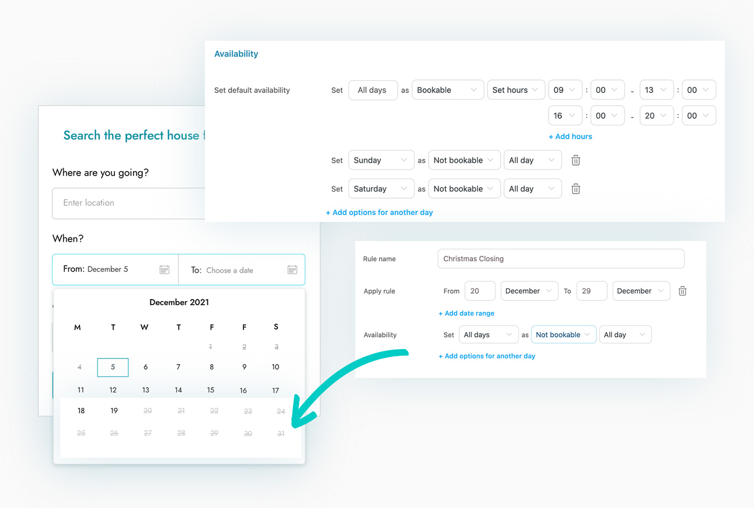 You can configure a booking product without any limitations or enable/disable specific days or times. Do you give cooking lessons only on Tuesday and Thursday from 5 pm to 8 pm and do you want your users to be able to book only these days and time slots? You can do it! Do you want to make the sea view apartment unavailable in August because you want to use it yourself? Or not accept bookings and appointments for two weeks so you can go on vacation? With availability rules, you can manage any scenario.