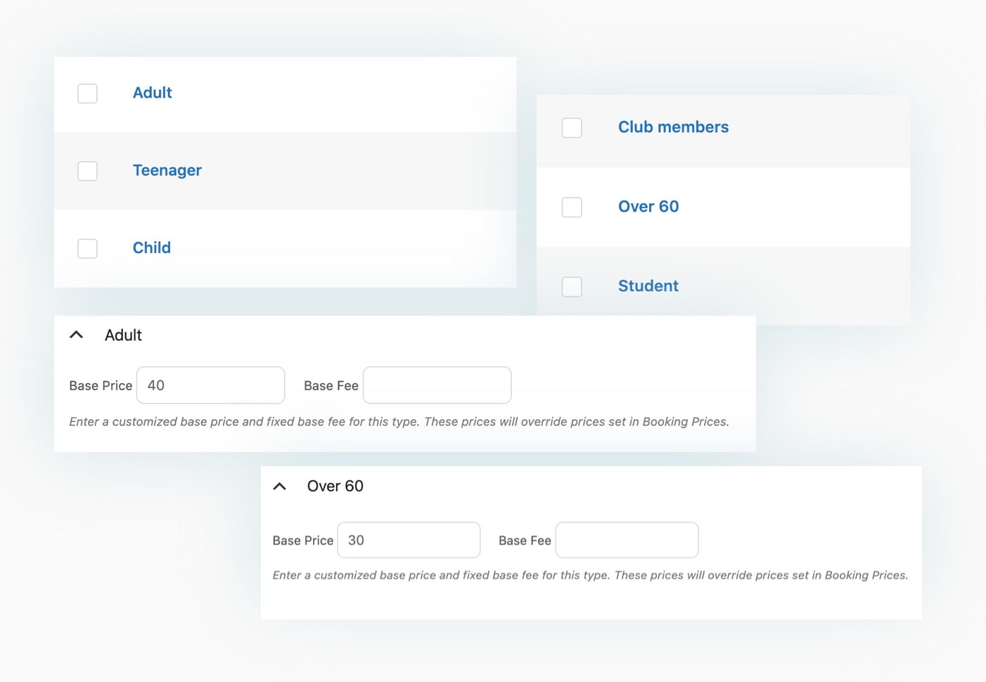 Create unlimited “person” types to set different prices based on age, role, disability, etc.