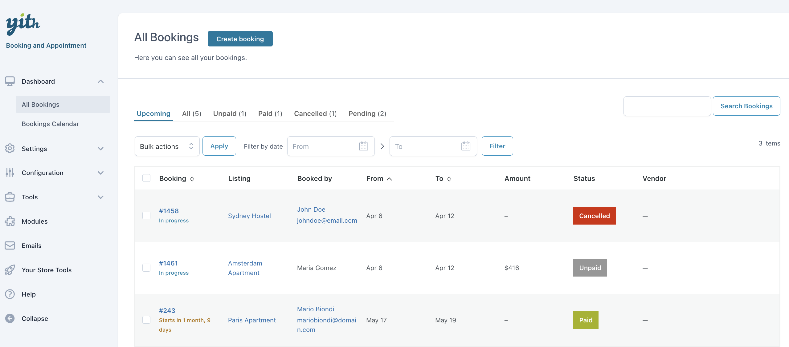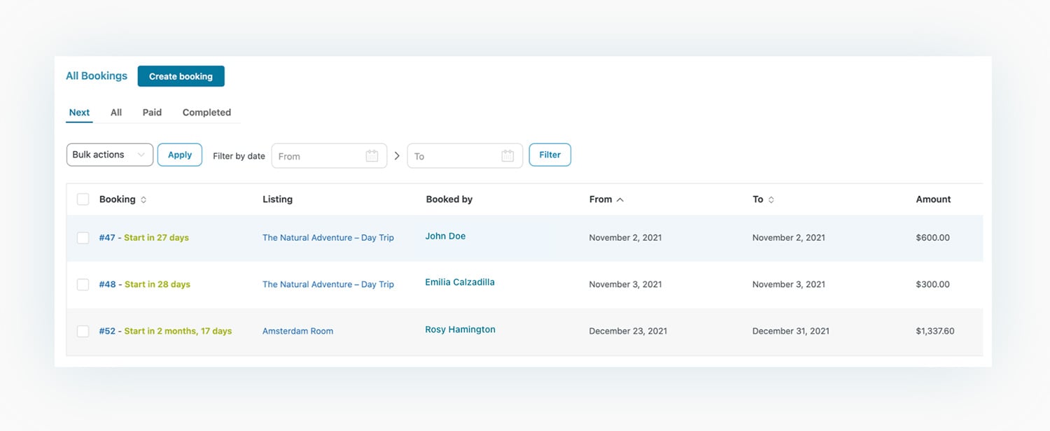 Do you have many bookings and don’t want to lose your mind? The plugin includes a handy table where all bookings are added automatically. You can filter them by date and choose to view them all or only the next arrivals, bookings already paid, or completed, etc.
