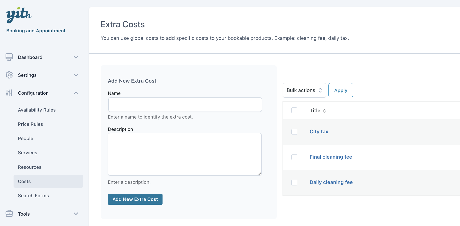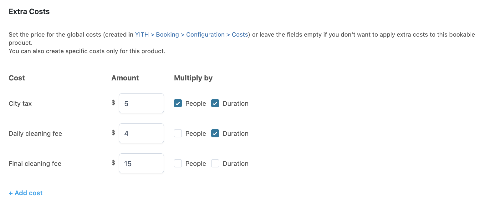 Create unlimited costs, fixed or multiplied by person, to apply to bookings