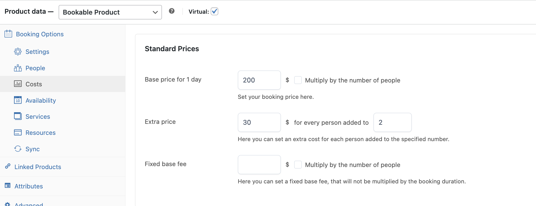 For each Booking product, you can choose the price that users will have to pay per hour/day/month. You can set a fixed price (e.g. €100 for an apartment) or multiply the cost per person (e.g. €100 for each person staying in the apartment). You can offer last-minute discounts and add unlimited custom prices (cleaning fee, tax, commissions, additional services, etc.).