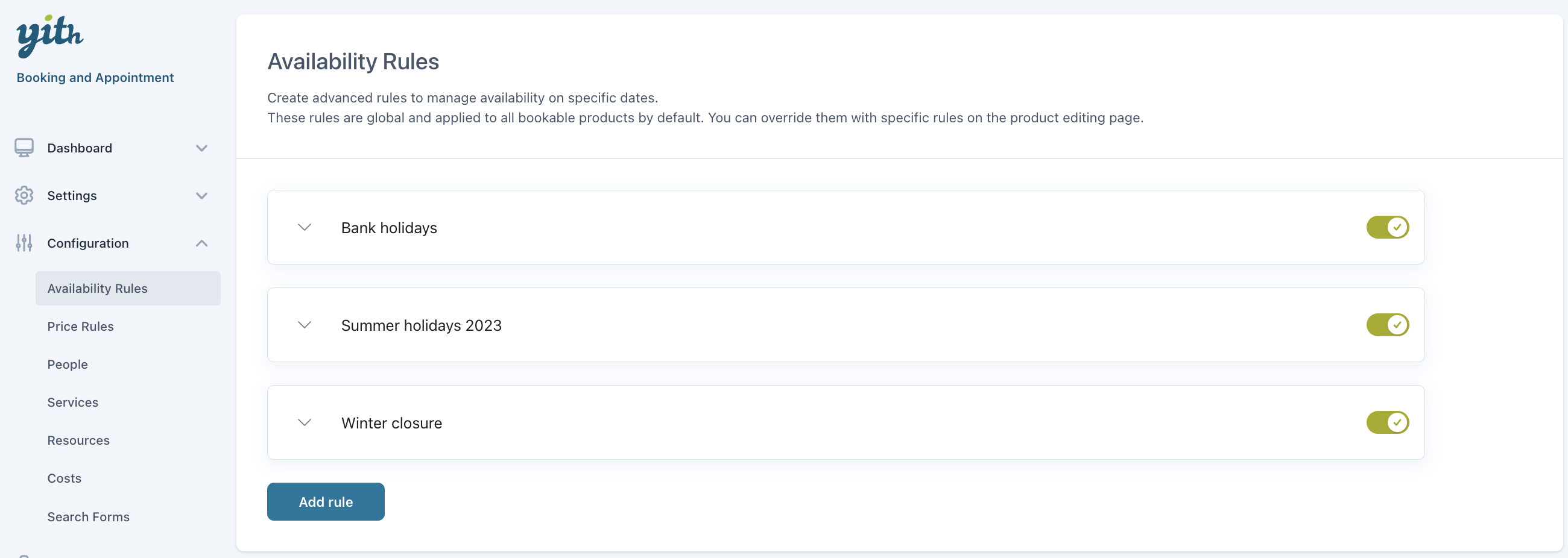 Set a default availability and create advanced rules to manage closures, sickness, scheduled holidays, etc.