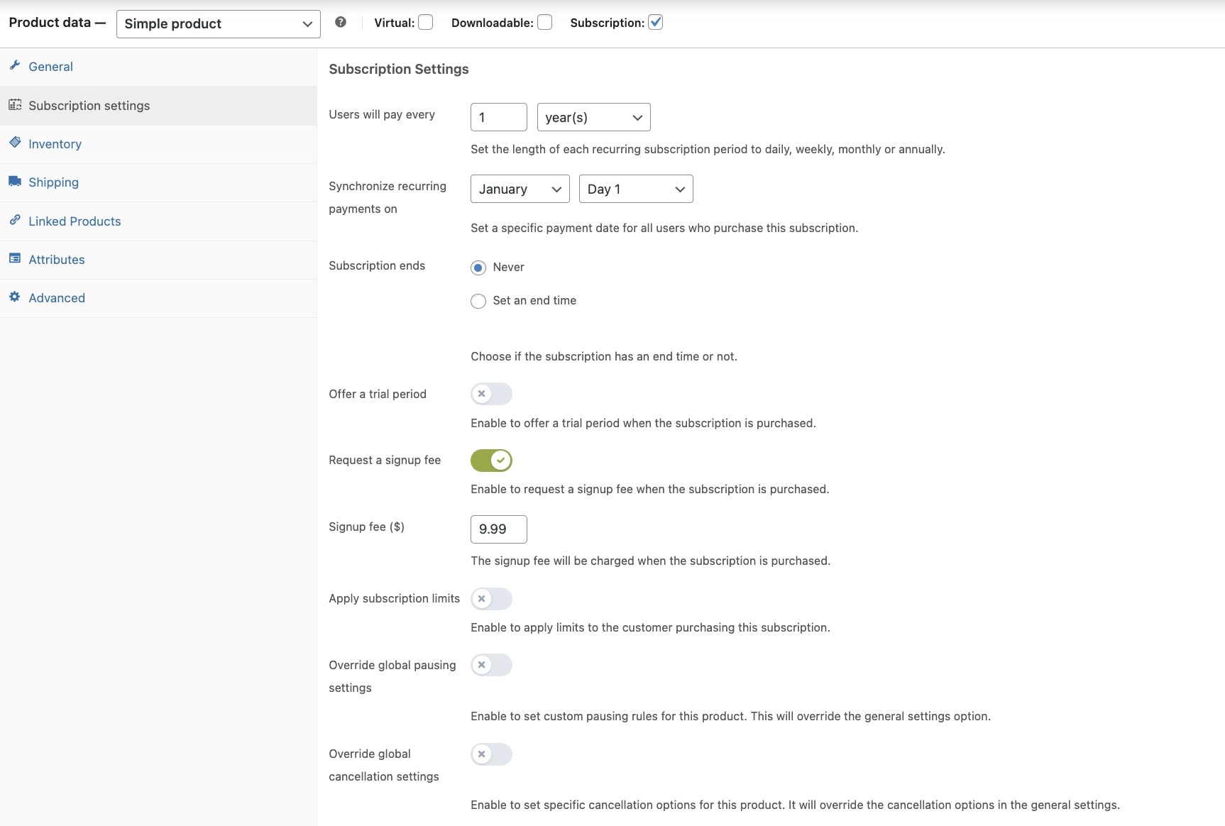 Lo strumento più facile per creare un prodotto o servizio da offrire in abbonamento ai tuoi clienti: devi solo definire che tipo di pagamento ricorrente vuoi impostare (giornaliero, settimanale, mensile, annuale, ecc.) e l’importo dell’abbonamento. Bastano pochi clic per cominciare a vendere prodotti in sottoscrizione con WooCommerce!