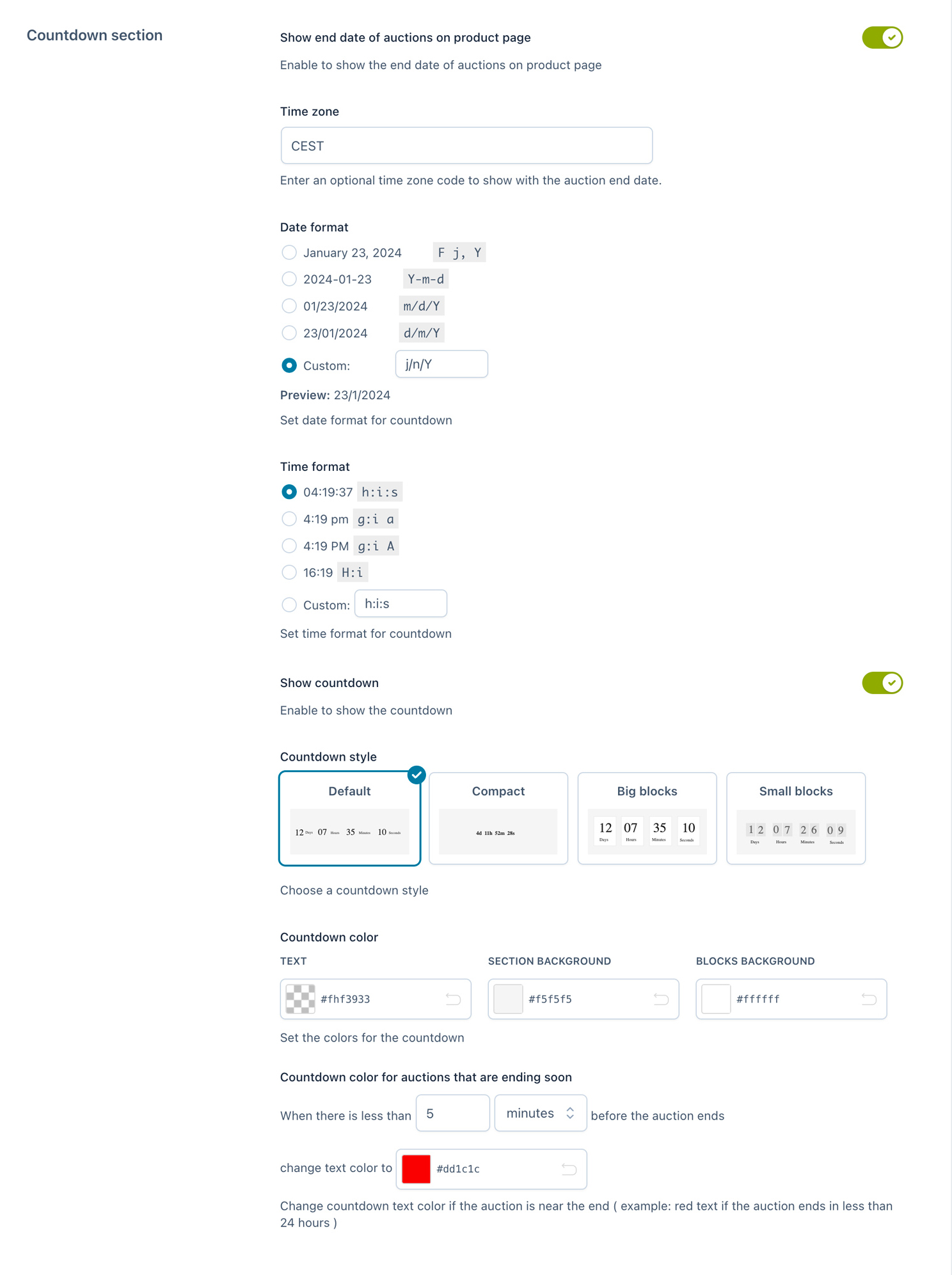 Elige entre 4 diseños diferentes para la cuenta regresiva (o solo muestra la duración de la subasta)