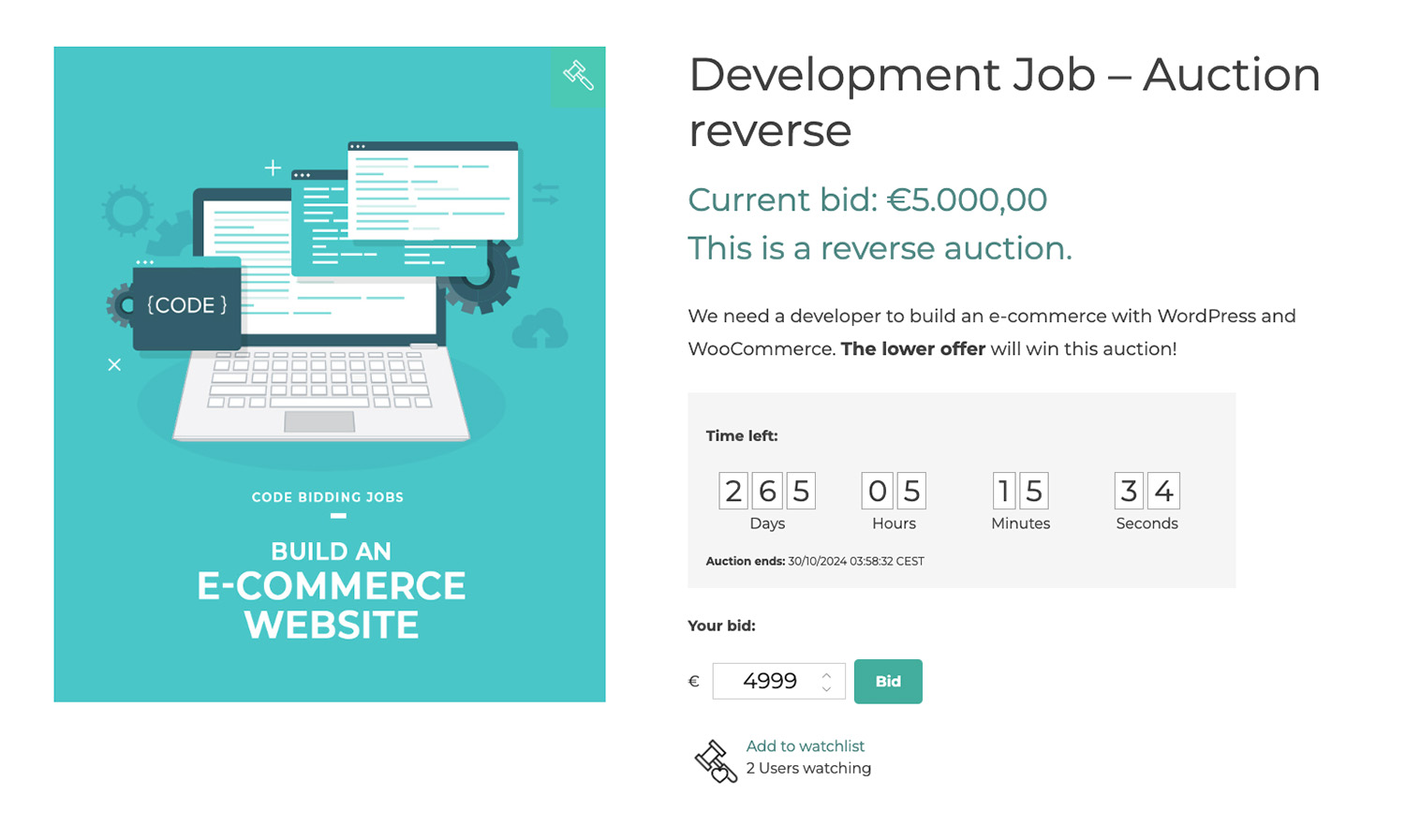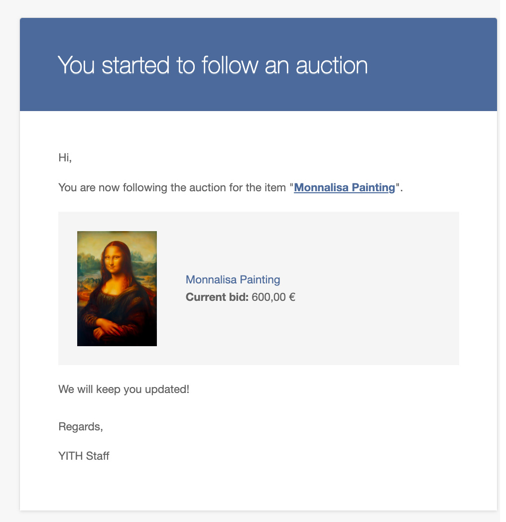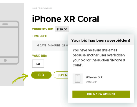 Permite a tus usuarios elegir entre apuntarse a la subasta y recibir notificaciones por correo electrónico o añadir la subasta a una »lista de seguimiento» que pueden seguir a través del widget relacionado o en su cuenta.
