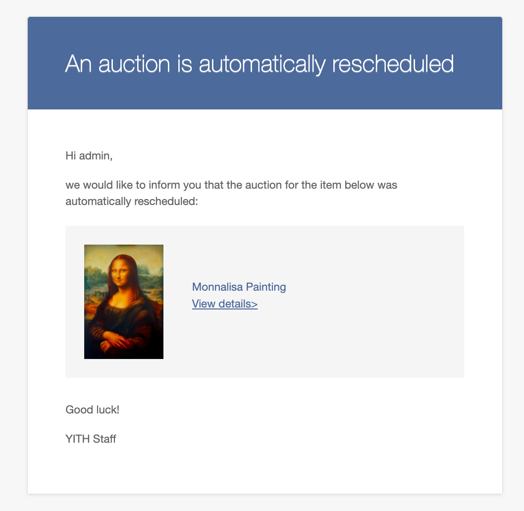 Envía avisos a los usuarios que siguen la subasta y a todos los participantes cada vez que se realiza una nueva oferta, cuando la subasta está a punto de finalizar, cuando sus ofertas son superadas (para pedirles que hagan una nueva oferta) y cuando finaliza la subasta.