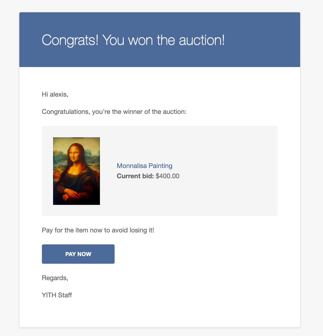 Envia un correo electrónico al ganador de la subasta para pedirle que pague el artículo sin proporcionar ninguna referencia puede resultar un arma de doble filo: para facilitar el proceso de pago del artículo subastado, puedes habilitar la opción y generar de forma completamente automática un pedido asociado con el artículo premiado. El pedido se generará con el estado «pendiente de pago» y el ganador de la subasta será redirigido con un correo electrónico directamente al pago del mismo.