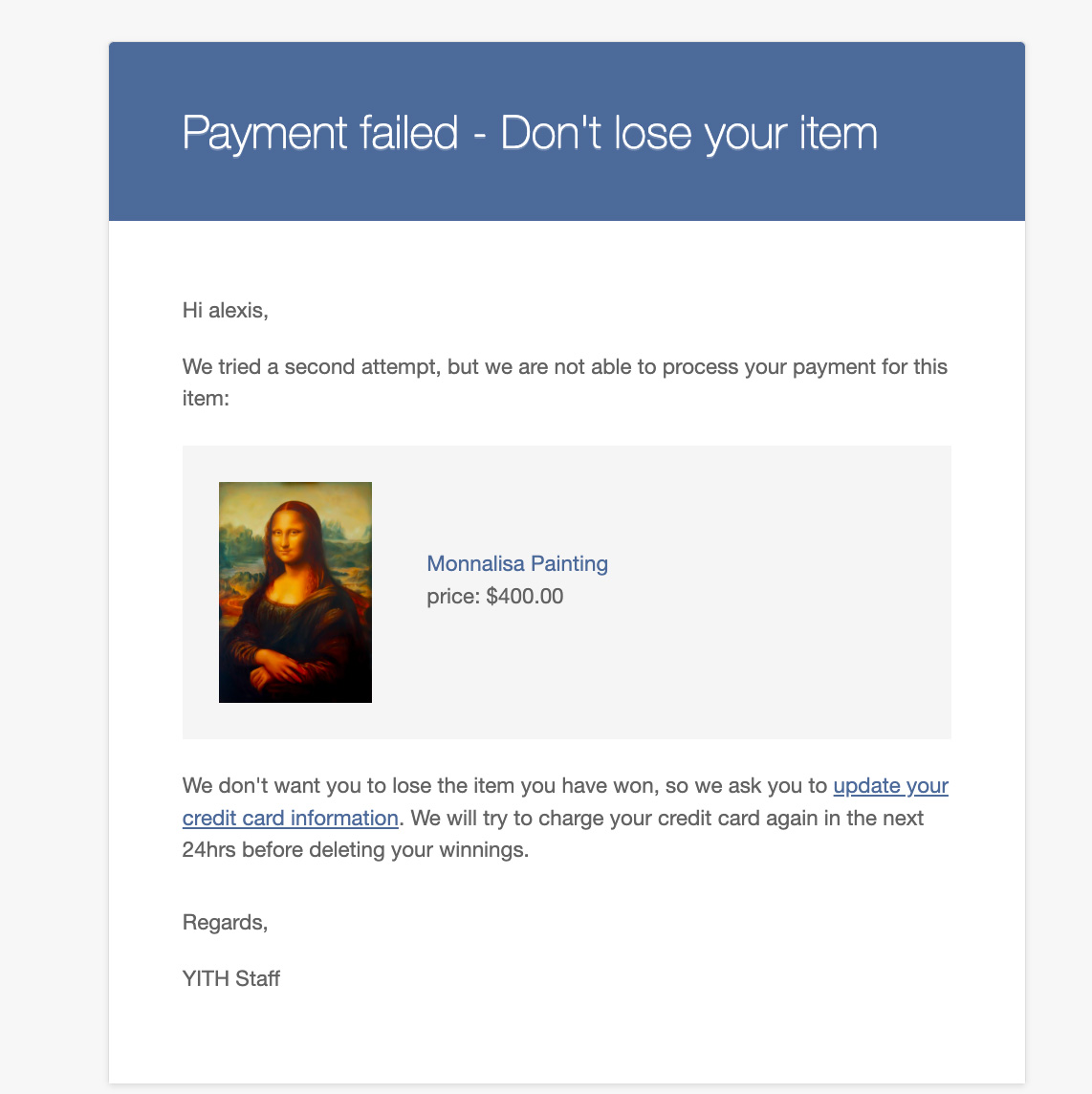Adeuda automáticamente el artículo premiado en la tarjeta de crédito del ganador