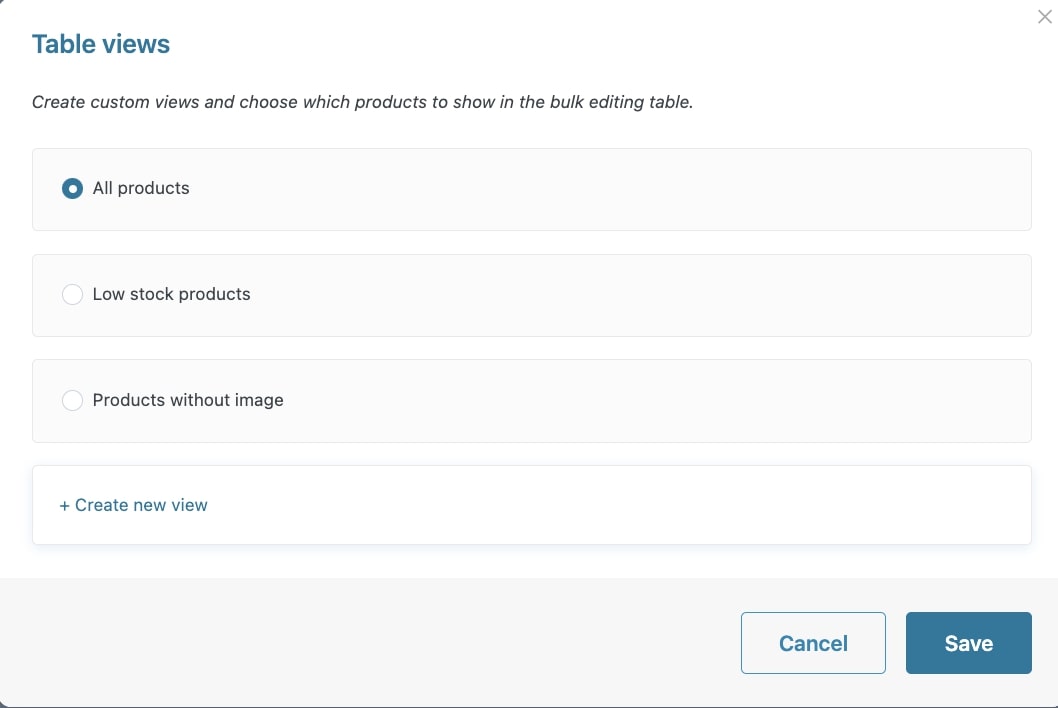 • crea e salva viste di prodotti per filtrare velocemente i prodotti da mostrare nella tabella di modifica di massa. Esempio: puoi creare una vista che mostri solo tutti i prodotti in offerta, una che mostri tutti i prodotti senza immagine, una che mostri solo i prodotti out of stock, ecc.;