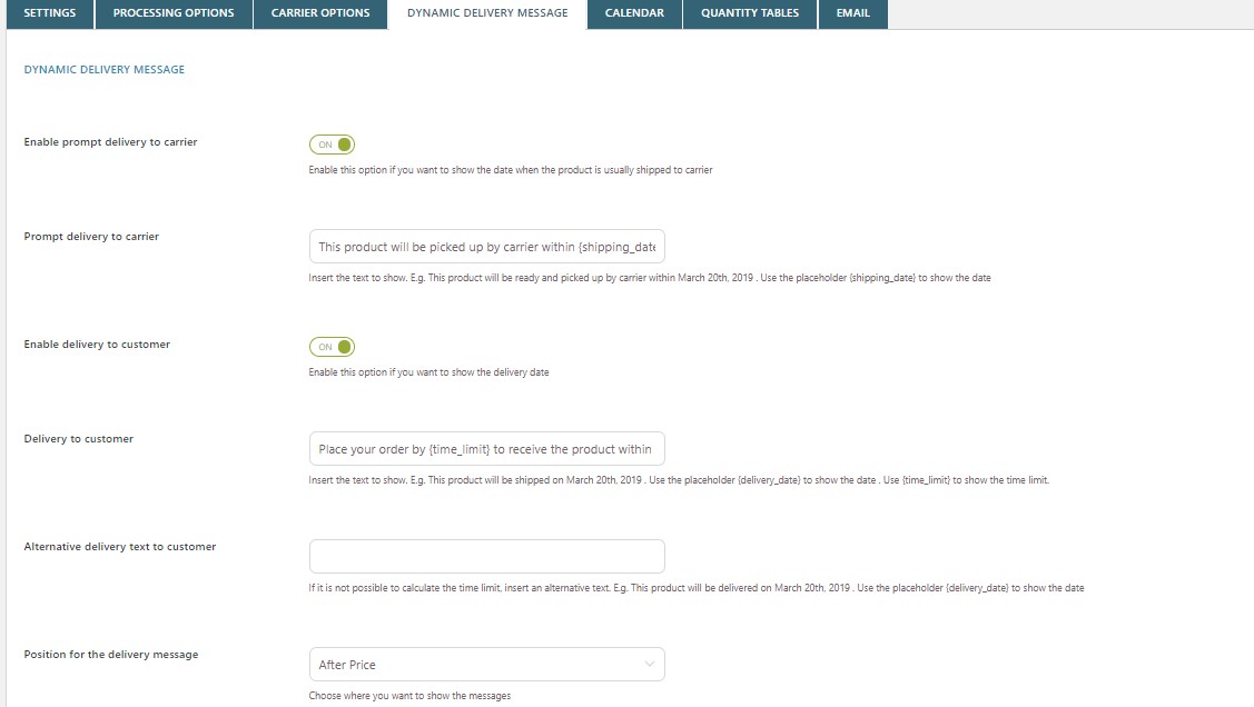 • Mostra nella pagina prodotto un messaggio con le date di consegna al corriere e al cliente New