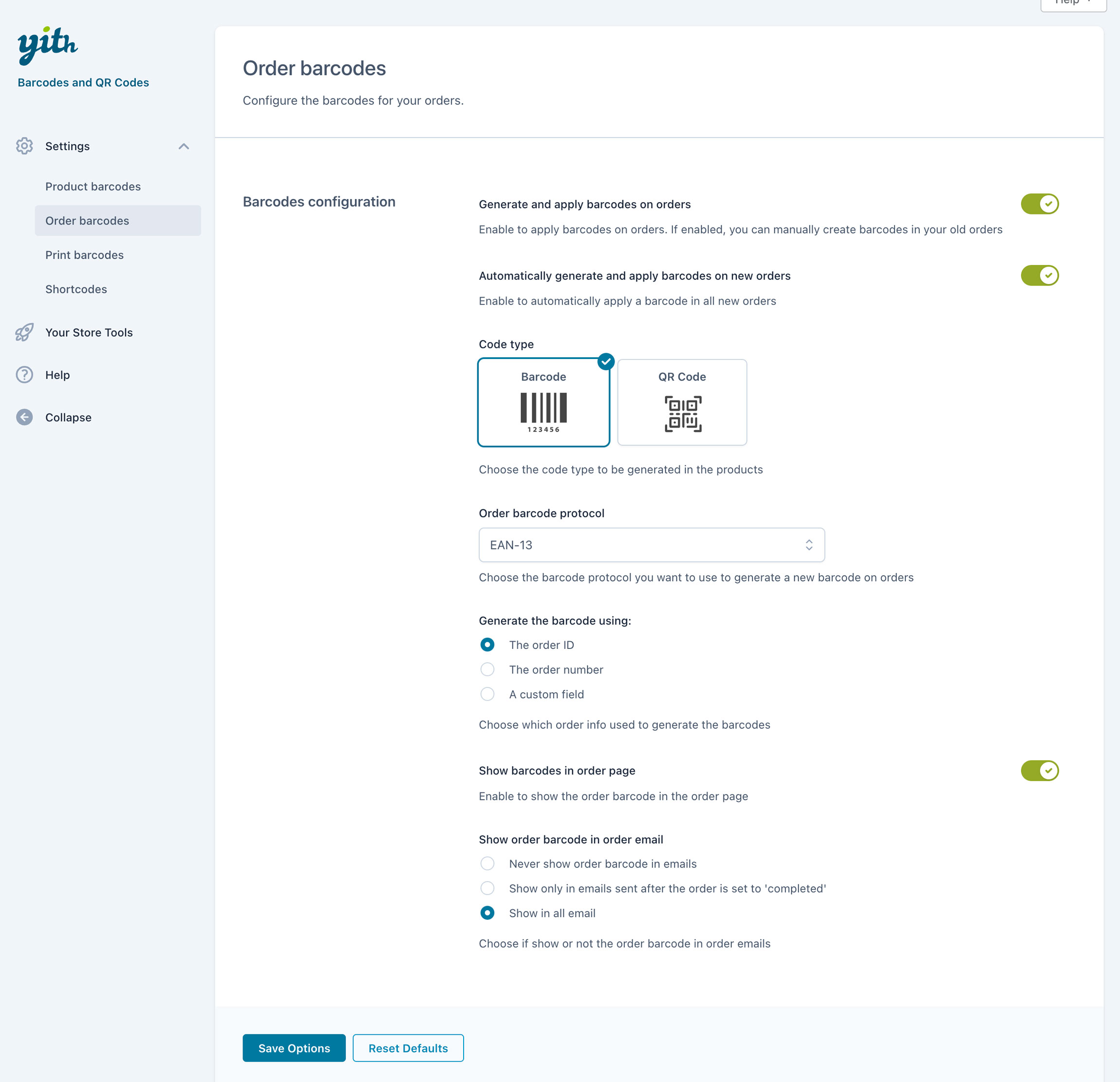 Il plugin ha l’opzione per mostrare il codice a barre dell’ordine in tutte le email o solo in quelle per gli ordini completati.