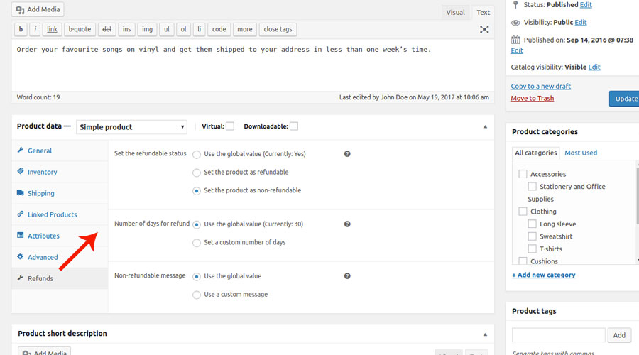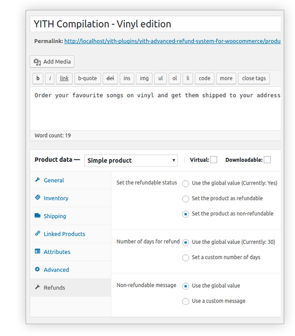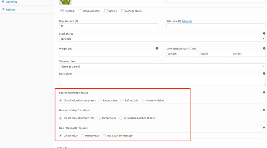 Imposta regole di rimborso specifiche per i prodotti semplici o per singole variazioni del prodotto