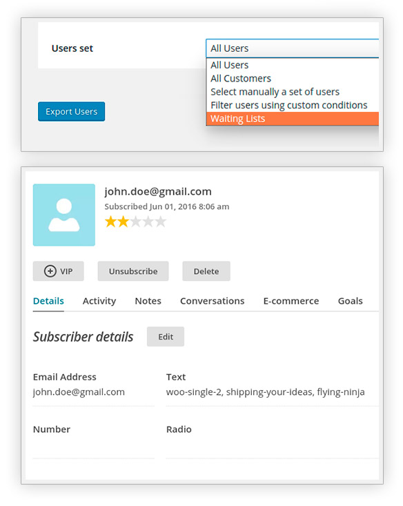 Utilizza questo plugin con YITH WooCommerce Waiting List per esportare su MailChimp la lista degli utenti che sono interessati ai prodotti momentaneamente non disponibili