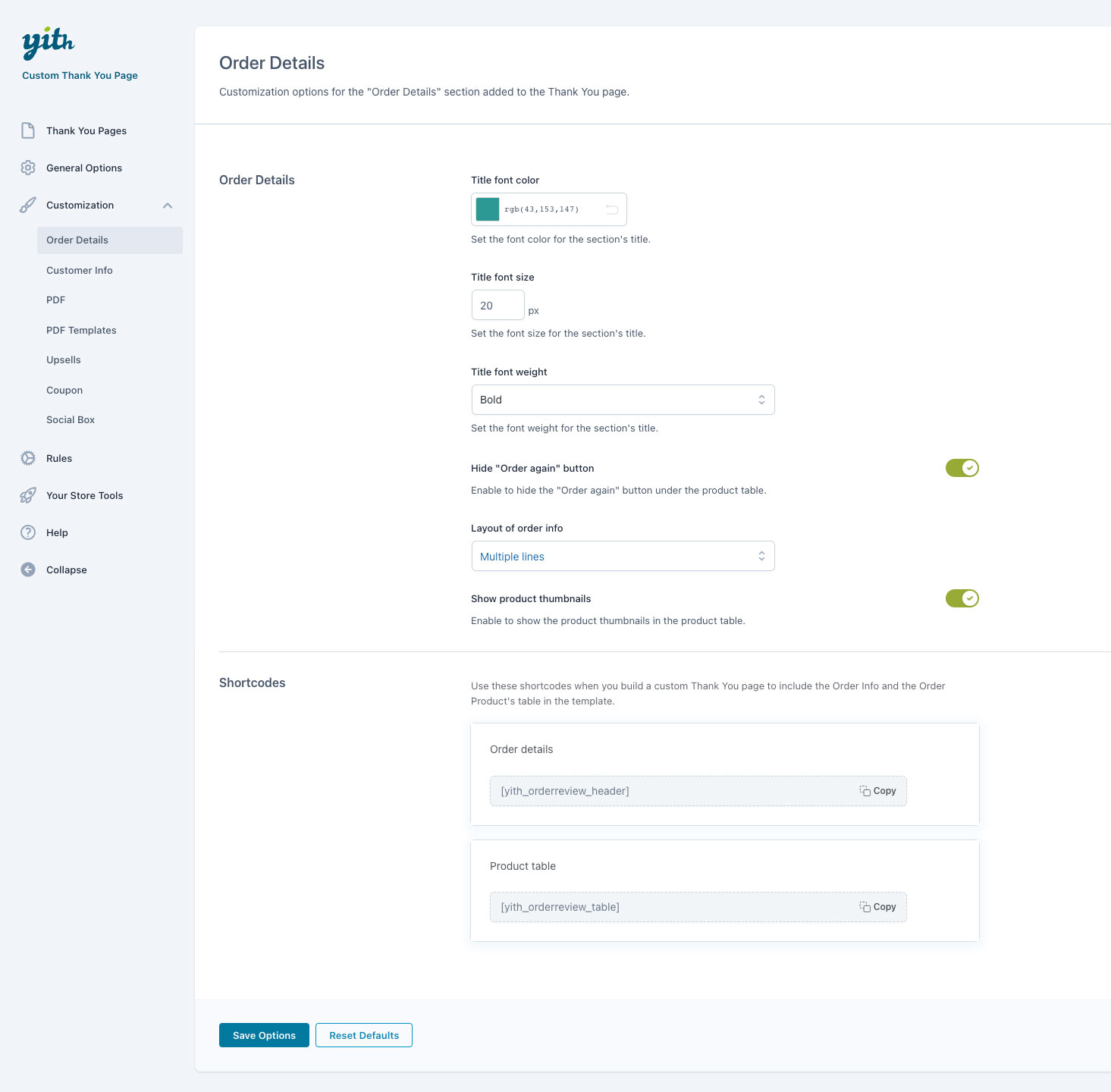 La sezione piu importante della pagina di ringraziamento è quella che contiene un riassunto dell’ordine effettuato: tabella dei prodotti (con dettaglio dei prezzi e della quantità acquistata), metodo di spedizione, metodo di pagamento, ecc. Questa sezione offre al cliente una panoramica sull’acquisto appena realizzato e gli permette di verificare che ogni informazione (taglia, colore, quantità, prezzo..) sia corretta. Il plugin ti permette di scegliere quali elementi mostrare o meno, oltre che di personalizzare colori e tipografia (potrai ad esempio mostrare le immagini dei prodotti, cosa non disponibile nella pagina di default di WooCommerce).