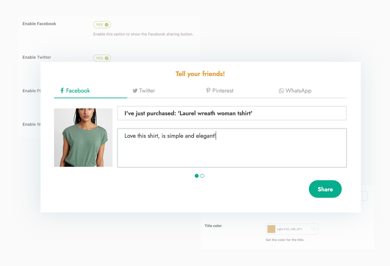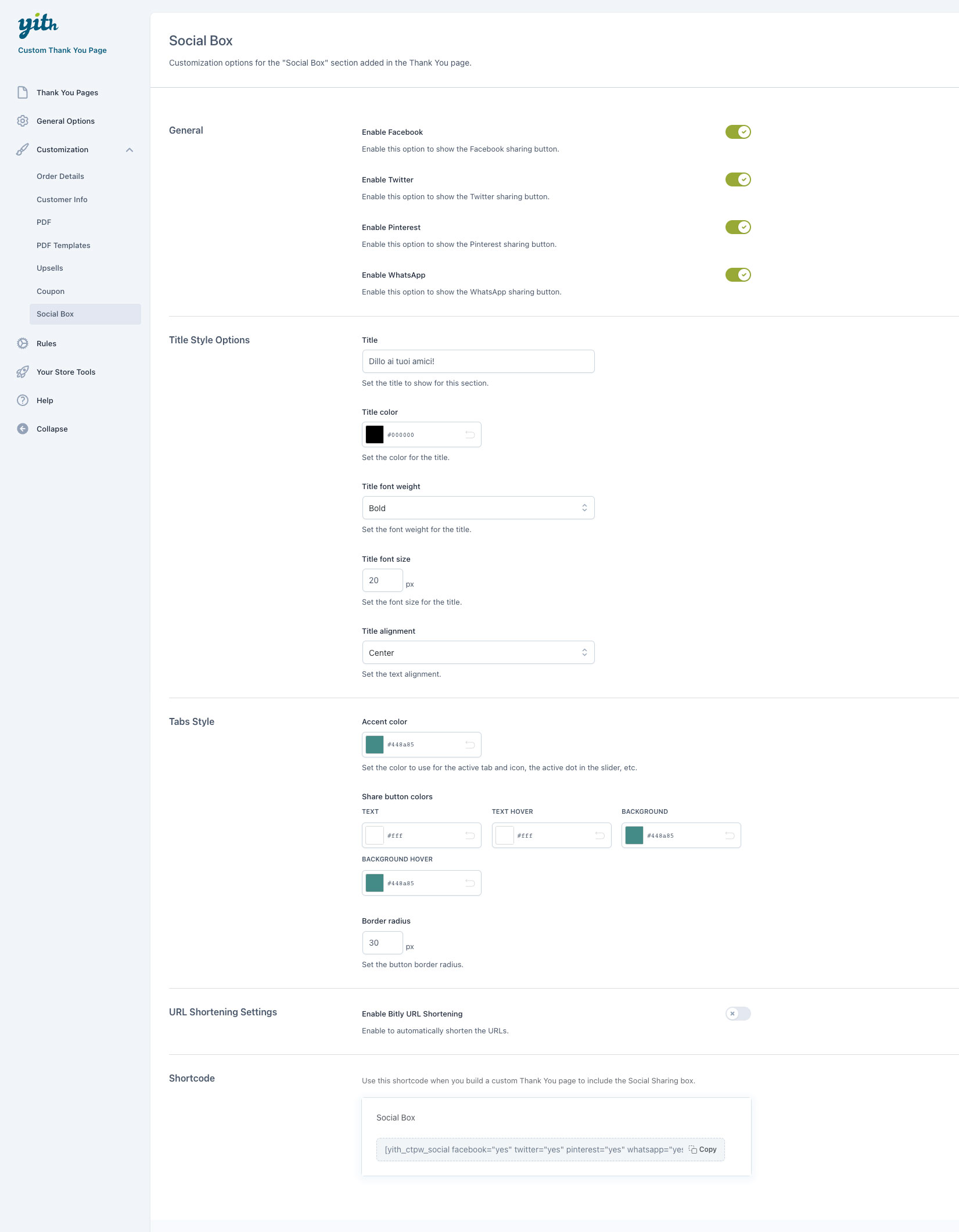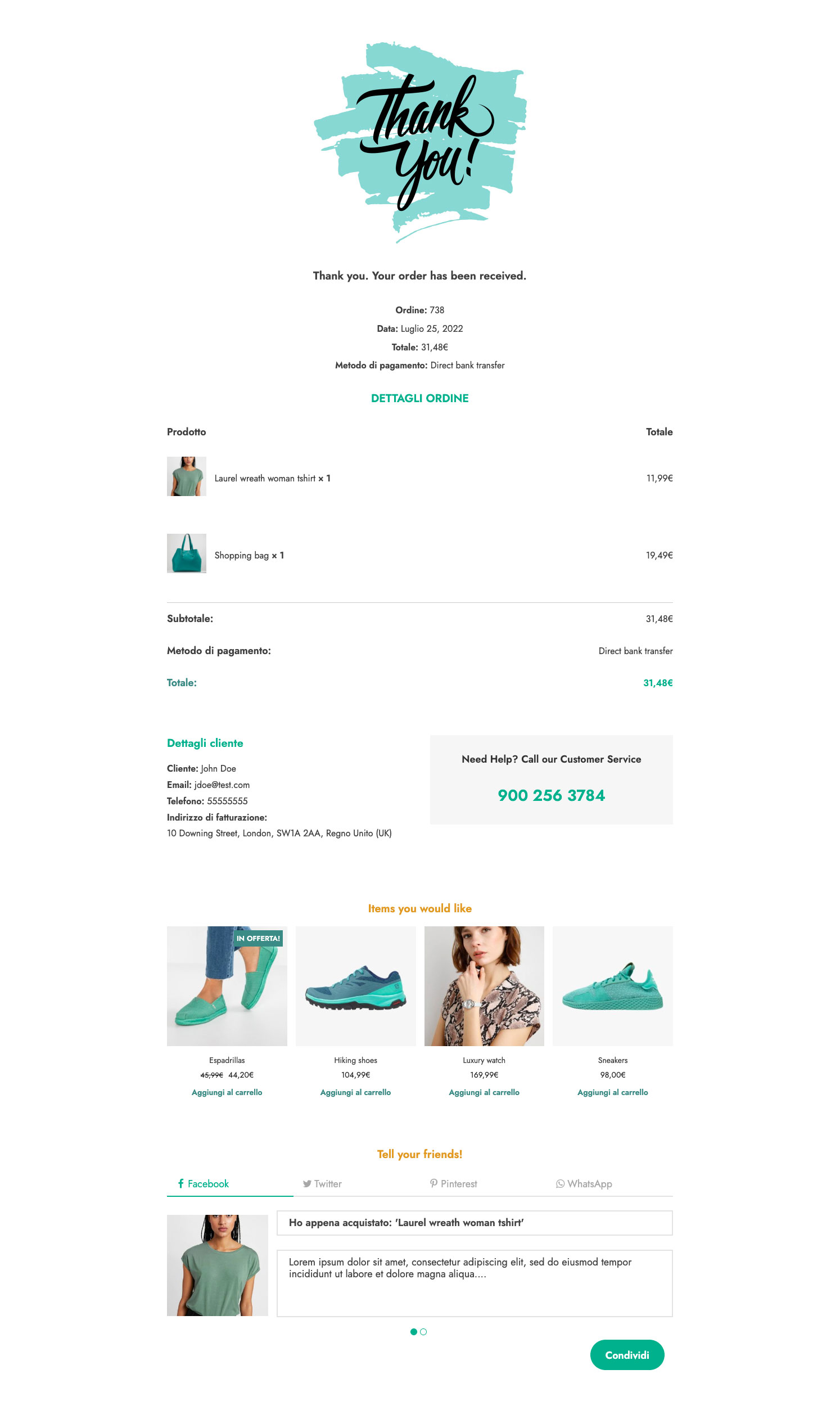 Una piccola chicca extra per rendere la pagina di ringraziamento più interessante? Permetti ai tuoi clienti di condividere nei loro profili social (o tramite WhatsApp) i loro acquisti. É un buon modo per far parlare del tuo shop e generare traffico, specialmente se alcuni dei tuoi clienti sono “influencer” e possono contare su un buon seguito sui socia 😉