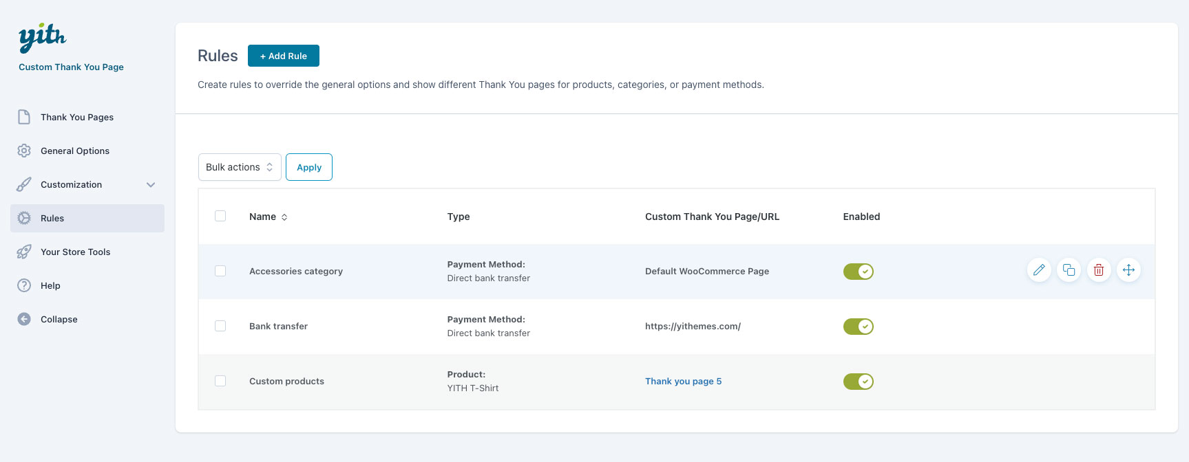 Crea un’unica pagina di ringraziamento per tutti gli ordini effettuati sul tuo shop o, se preferisci, creane multiple e imposta delle regole per mostrare pagine di ringraziamento diverse in base ai prodotti o categorie di prodotto acquistate dai clienti o in base al metodo di pagamento utilizzato per l’ordine. Grazie alle regole, ad esempio, potrai inserire le istruzioni di montaggio o dei videotutorial nella pagina di ringraziamento SOLO SE l’utente ha acquistato un determinato mobile da assemblare, o suggerire un servizio premium di consegna a domicilio SOLO SE l’utente ha comprato prodotti voluminosi.