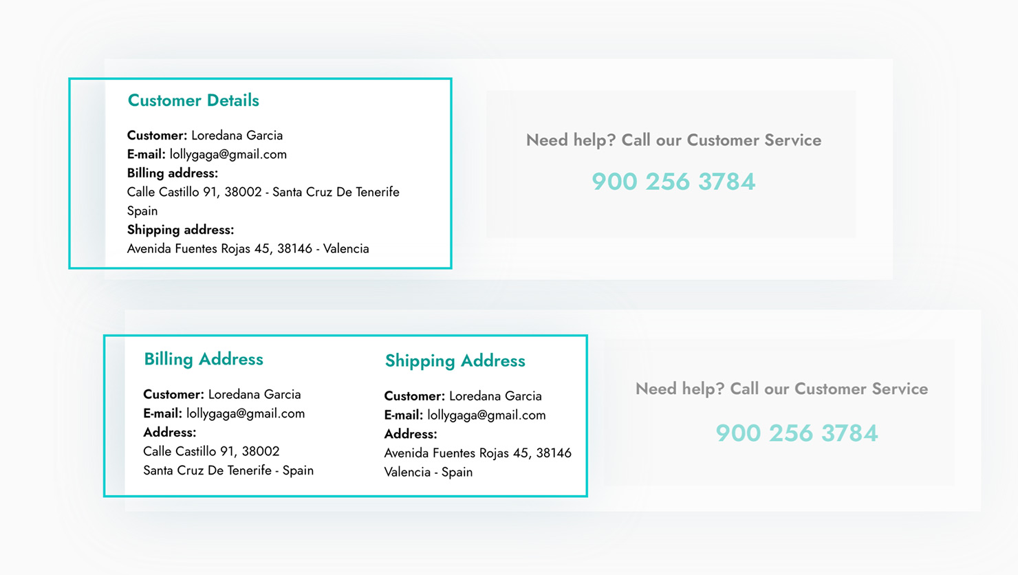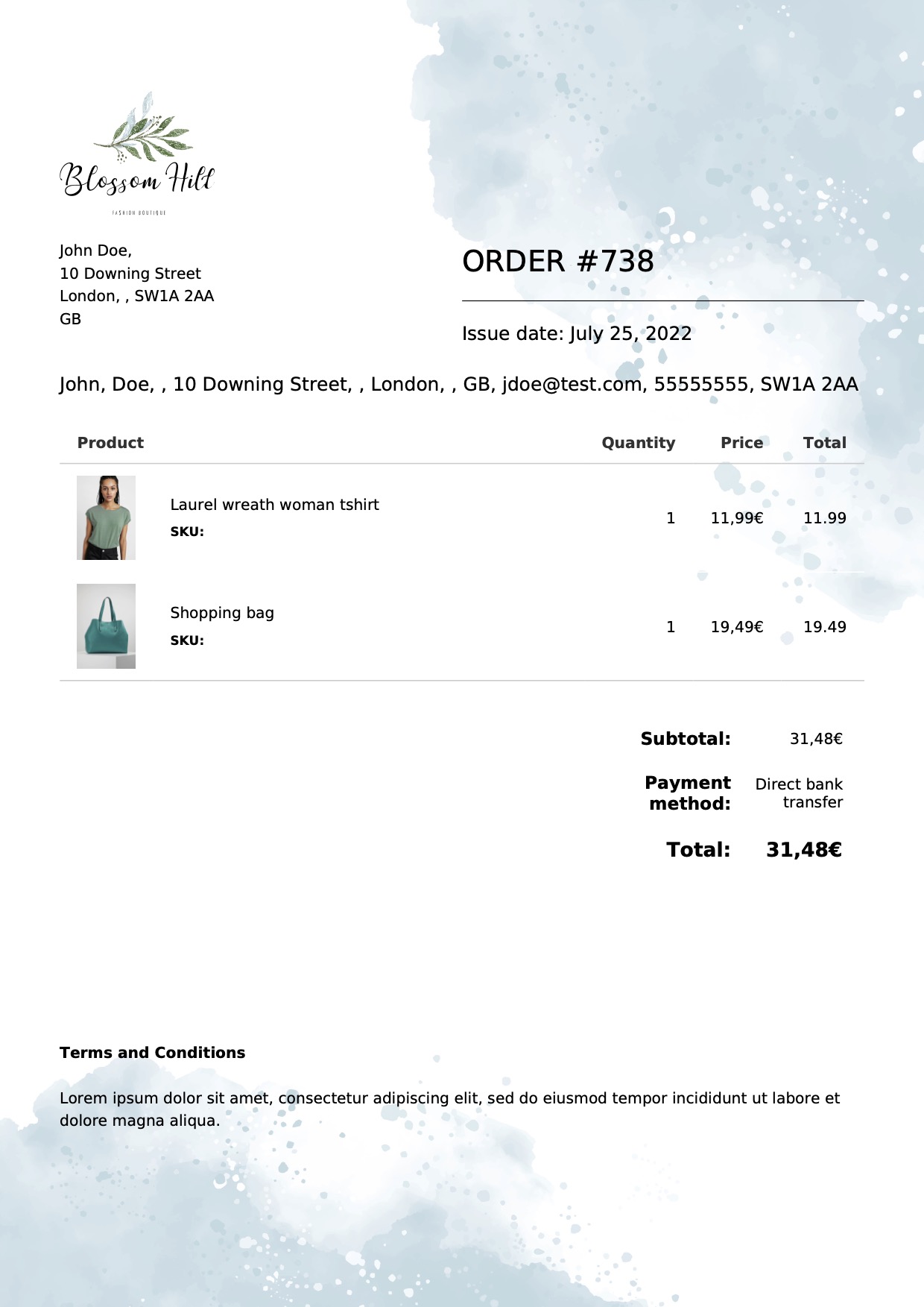 Grazie all’editor a blocchi puoi scegliere dove mostrare I dati del cliente (in alto, in basso dopo la tabella prodotti, ecc.) e attraverso le opzioni del plugin potrai personalizzare colori, formattazione dei testi e scegliere se mostrare le informazioni di fatturazione e di spedizione nello stesso blocco o se separarle in due colonne.