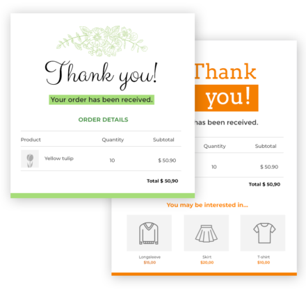 Vuoi creare una pagina di ringraziamento efficace e non sai da dove iniziare? Non preoccuparti: nel plugin troverai sei template già configurati, con illustrazioni e contenuti accattivanti. Puoi modificare uno dei template in base alle tue esigenze ed utilizzarlo nel tuo shop.