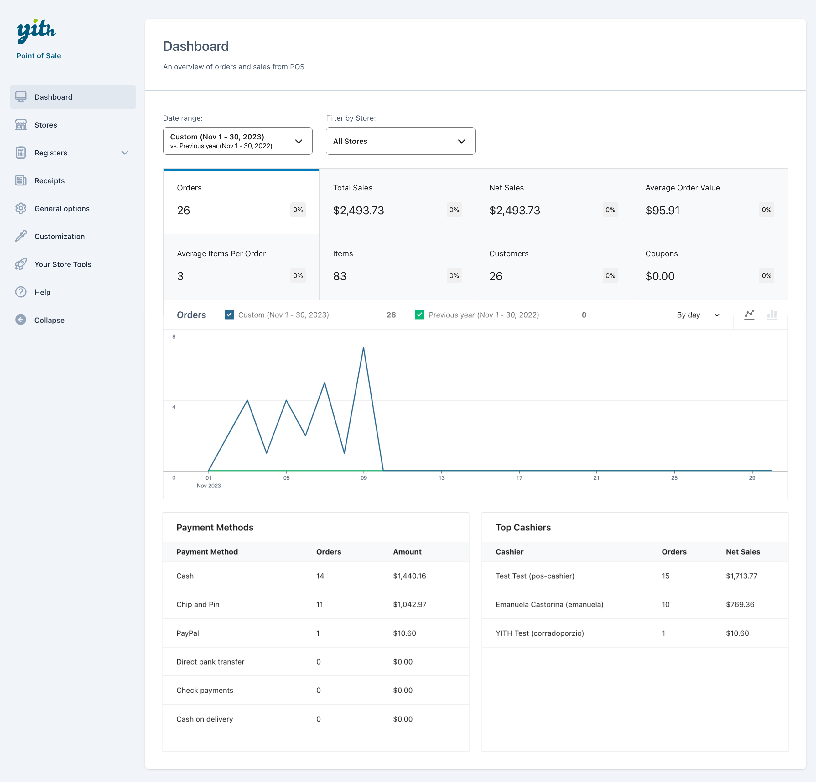 Grazie all’integrazione con WC Admin, potrai contare su una dashboard che ti permetterà di analizzare l’andamento delle vendite e dei guadagni realizzati in ogni punto vendita e di filtrare i dati per negozio, per cassa e per data. Potrai inoltre ottenere una panoramica sui cassieri che hanno registrato un maggior numero di vendite e sui metodi di pagamento utilizzati nelle casse.