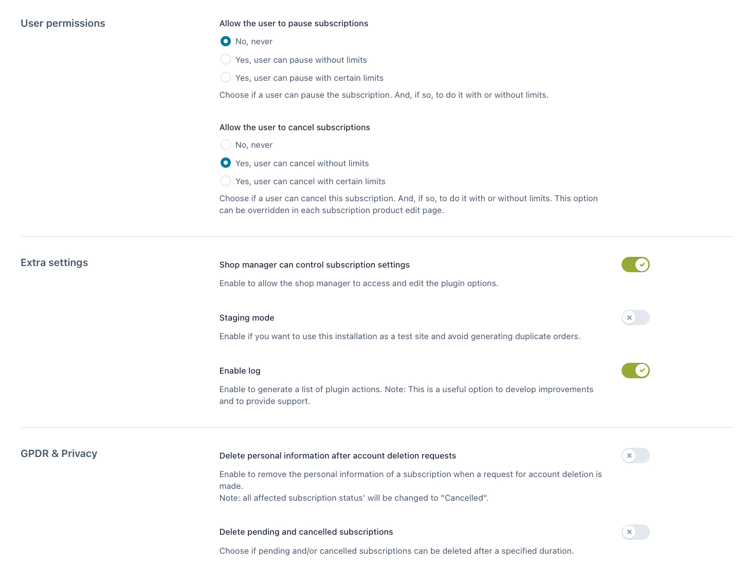Decide if you want to give users the option to pause their subscription, with the ability to set limits such as a maximum number of pauses or a maximum number of suspension days before automatic reactivation. Additionally, allow them to change their plans or cancel their subscription directly through their account.