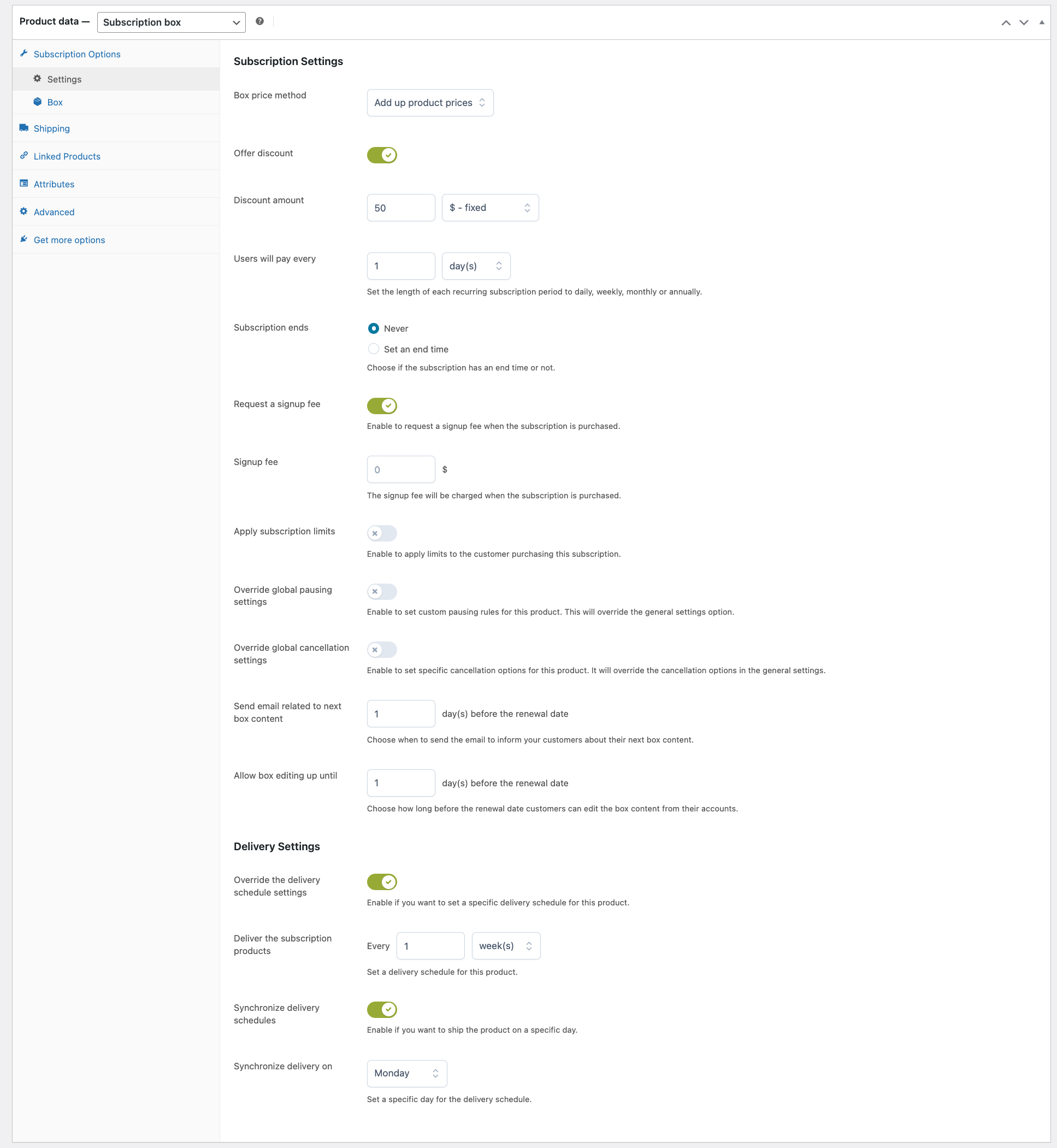 Does your customers’ subscription involve sending a product, such as a product box or a print magazine? Use the dedicated feature to schedule the shipment and choose whether to synchronize all mailings on a regular day. For example, you can set the box to be sent every 5th day of the month or the magazine every Monday.