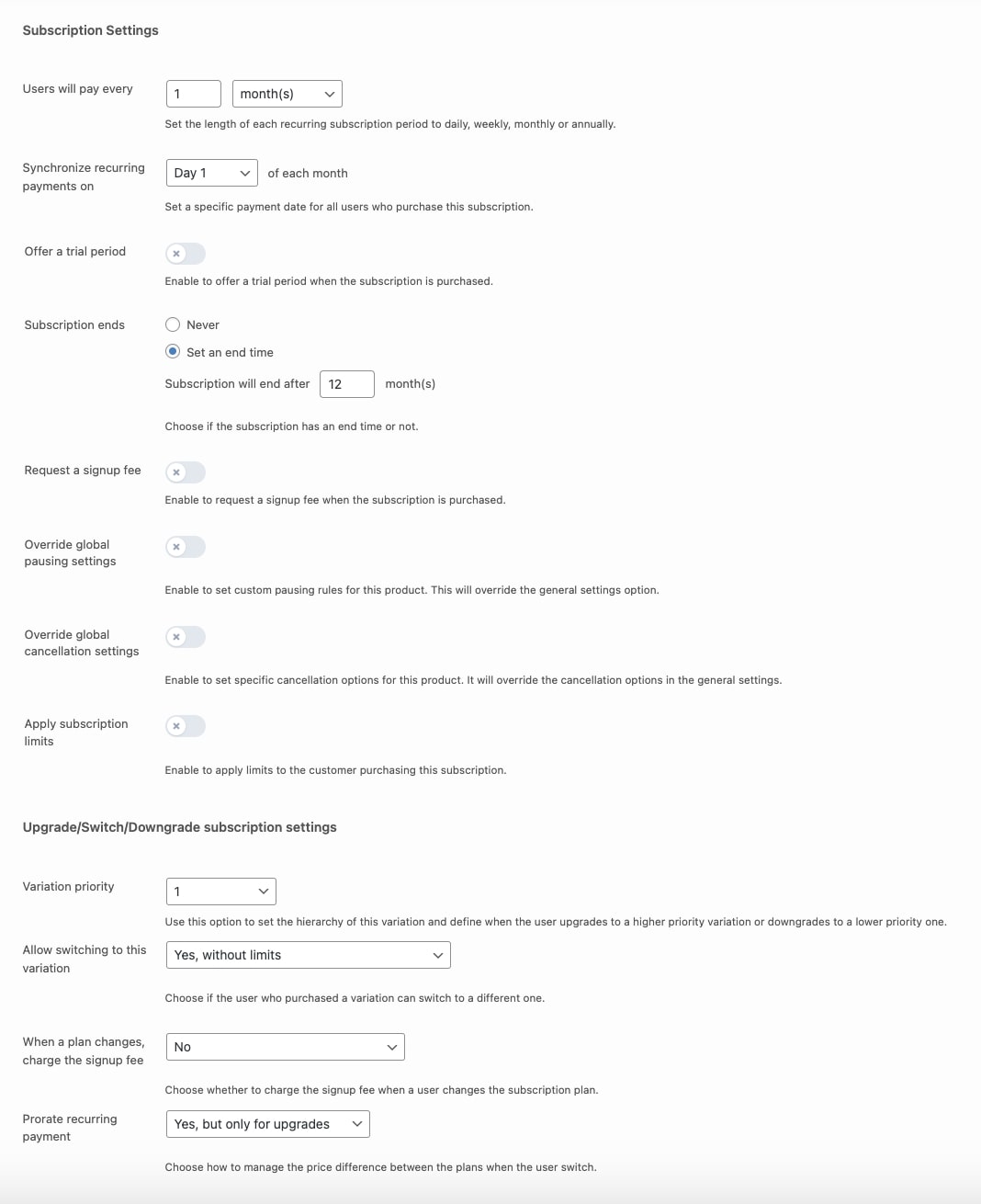 Use product variations to establish diverse subscription options, enabling users to modify their plans by upgrading, downgrading, or switching between them. Within these plans, you can customize the name and pricing for each one.