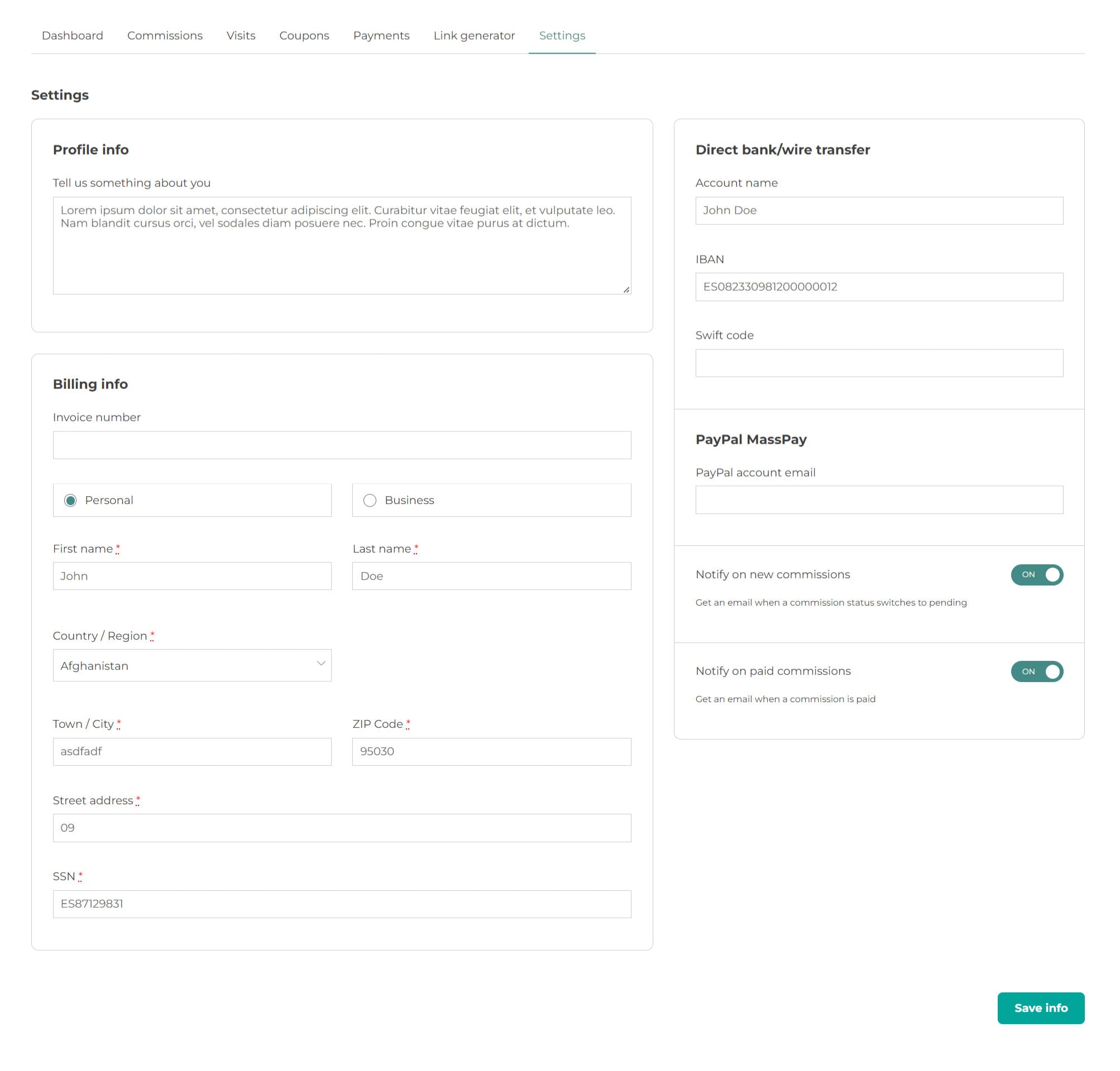 Choose whether to let affiliates access the affiliate dashboard through an endpoint available in My Account after they log in or in a custom page through the built-in shortcode. From the dashboard, affiliates will be able to get a broad overview of the leads (visits, clicks, etc.) and the generated commissions. They will be able to monitor their own credit and ask for the payment of the commissions (if the admin has enabled the related option), find their referral link and create new ones, edit their personal details (billing address, PayPal email to receive the payment, etc.) and much more.