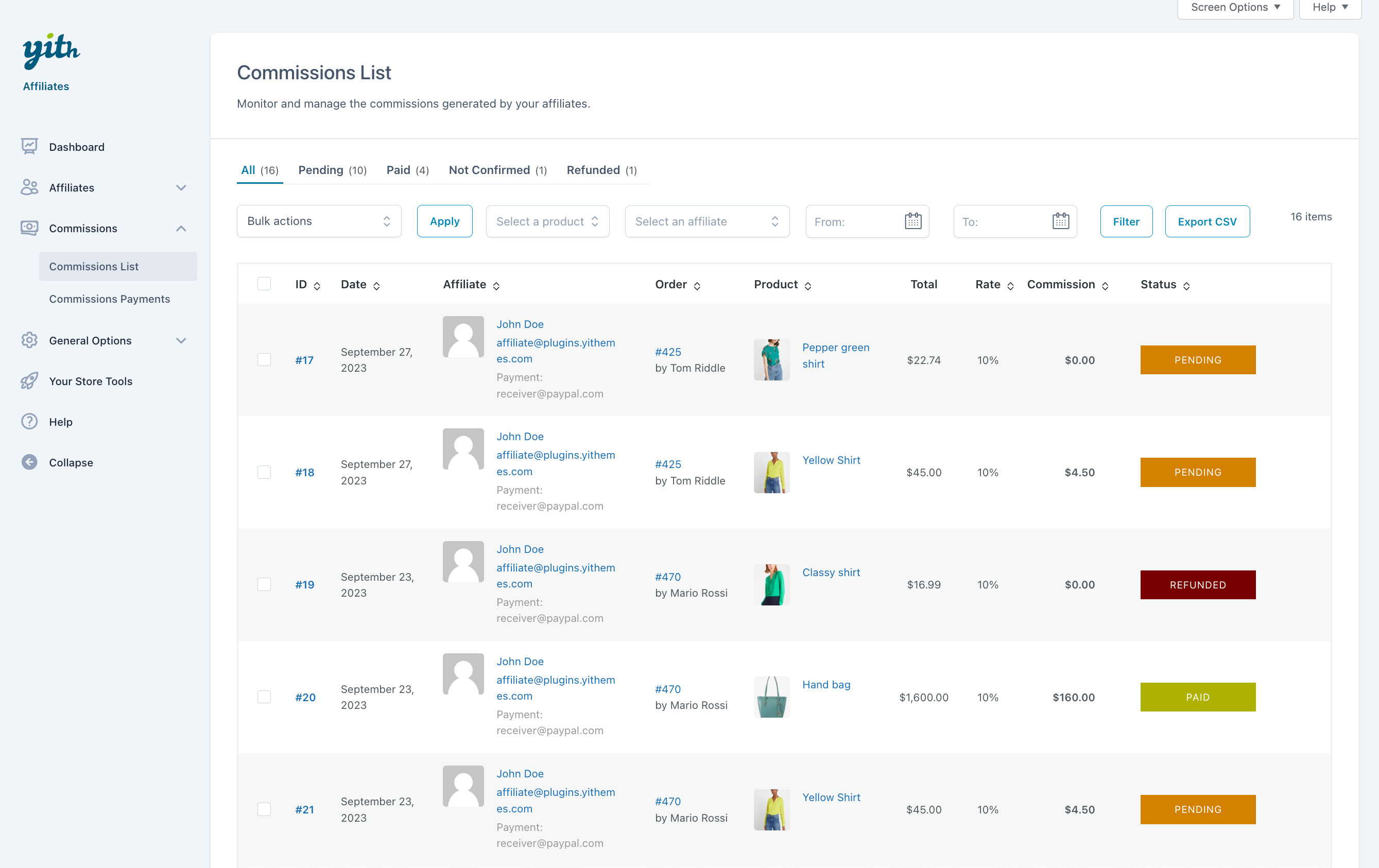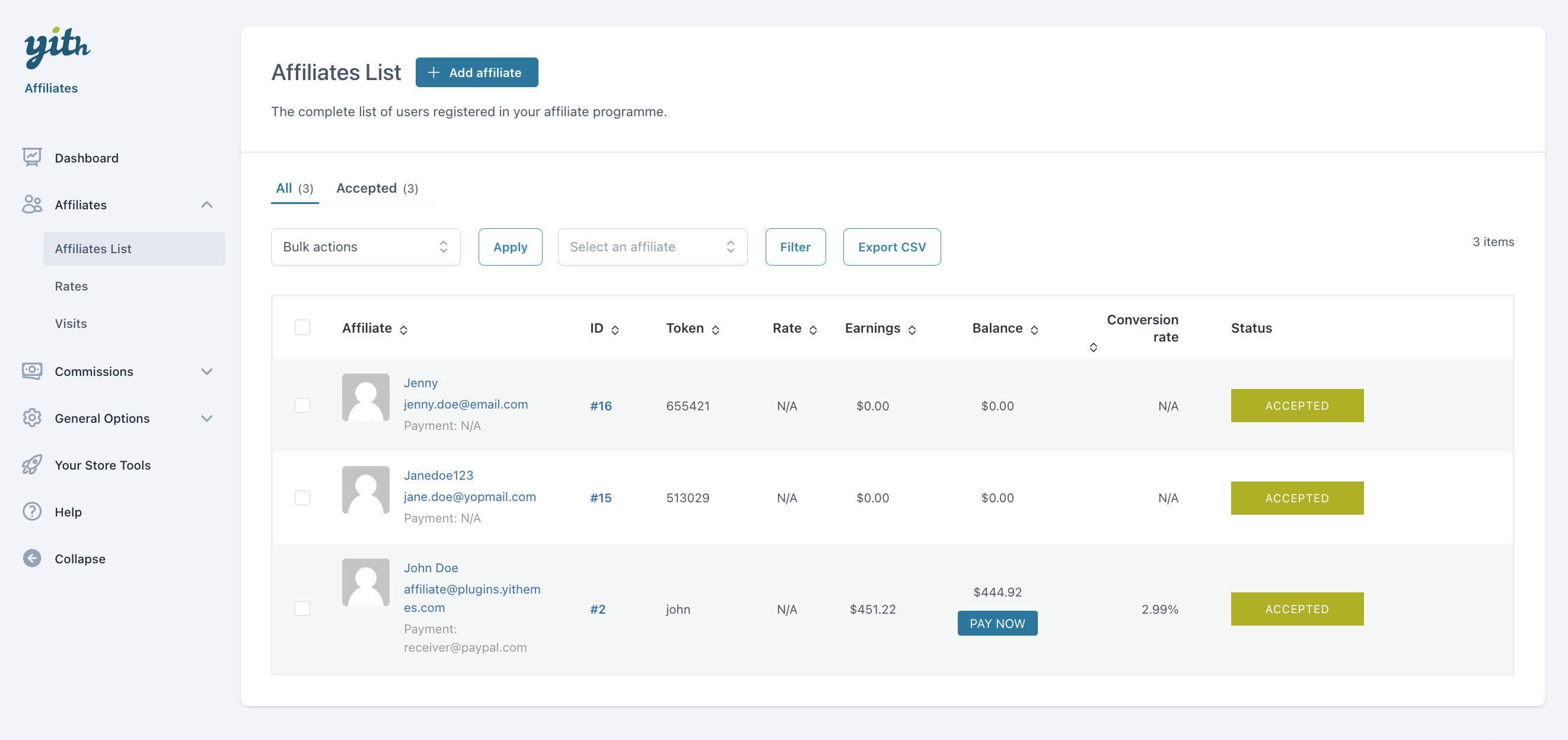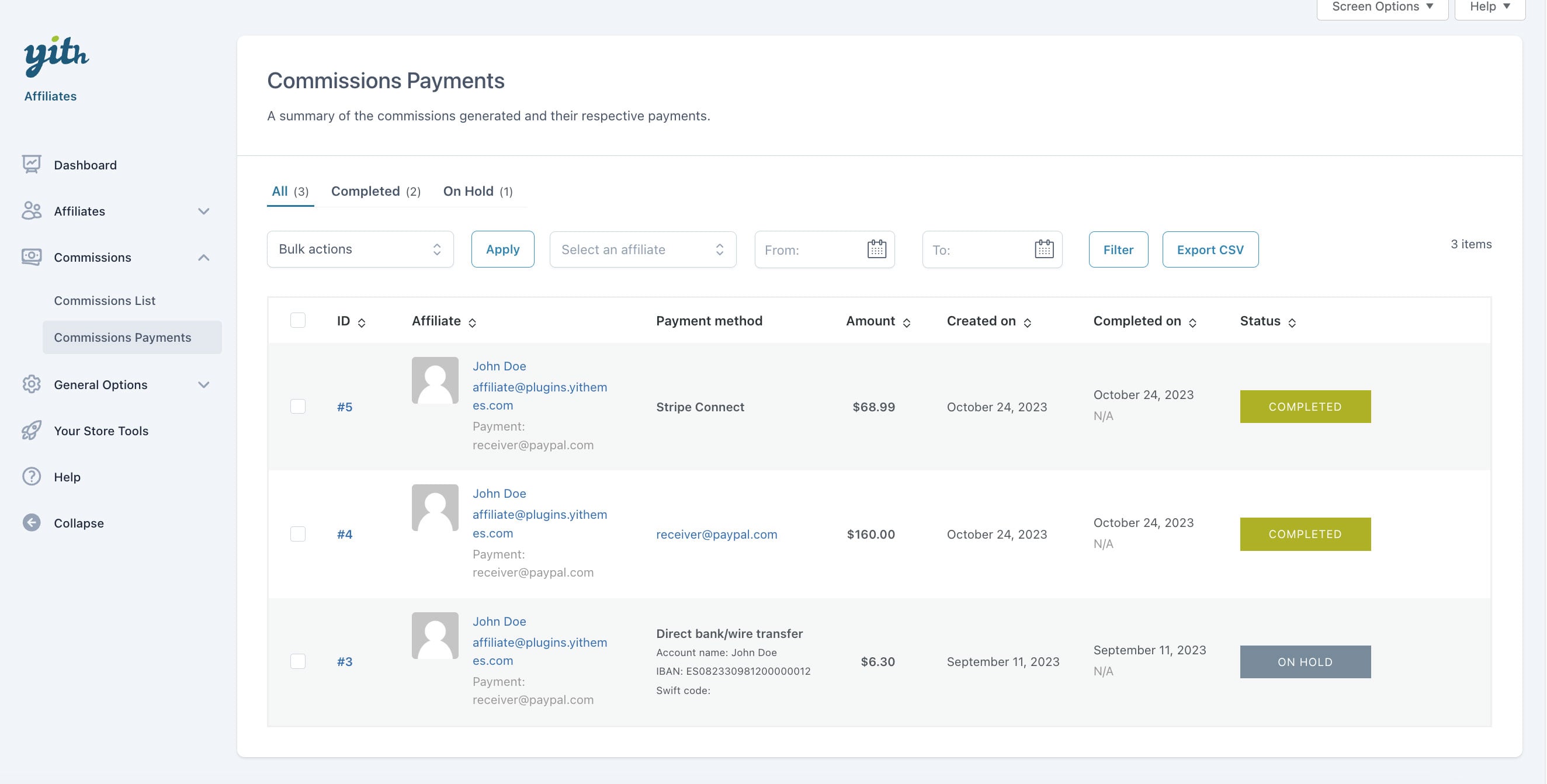 Pay the commissions manually by bank transfer (and then mark them as paid in the plugin panel) or, for easier and faster management, issue the payment through PayPal or Stripe. You can achieve this by combining it with our plugins YITH PayPal Payouts, YITH Account Funds or YITH Stripe Connect, completely automating the commissions payment, so the plugin will do all the work for you.