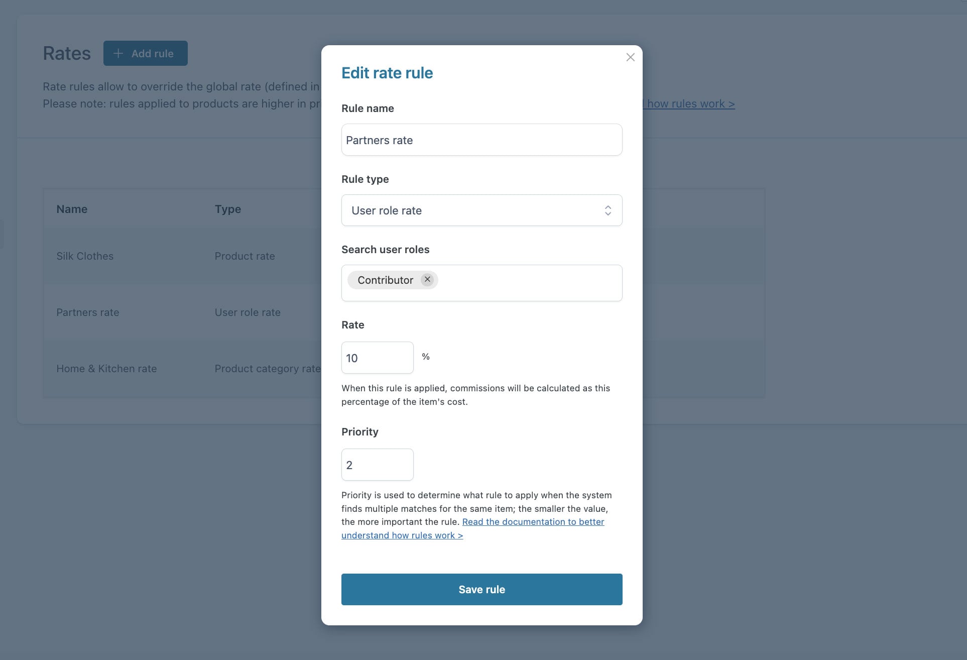 Set a global commission that will apply to all affiliates by default. You can override this value for specific affiliates and create custom rules to configure different commissions based on the promoted product or their specific user role. In this way, you can set, for example, a global 20% rate for all products and a higher or lower rate for one specific product only.