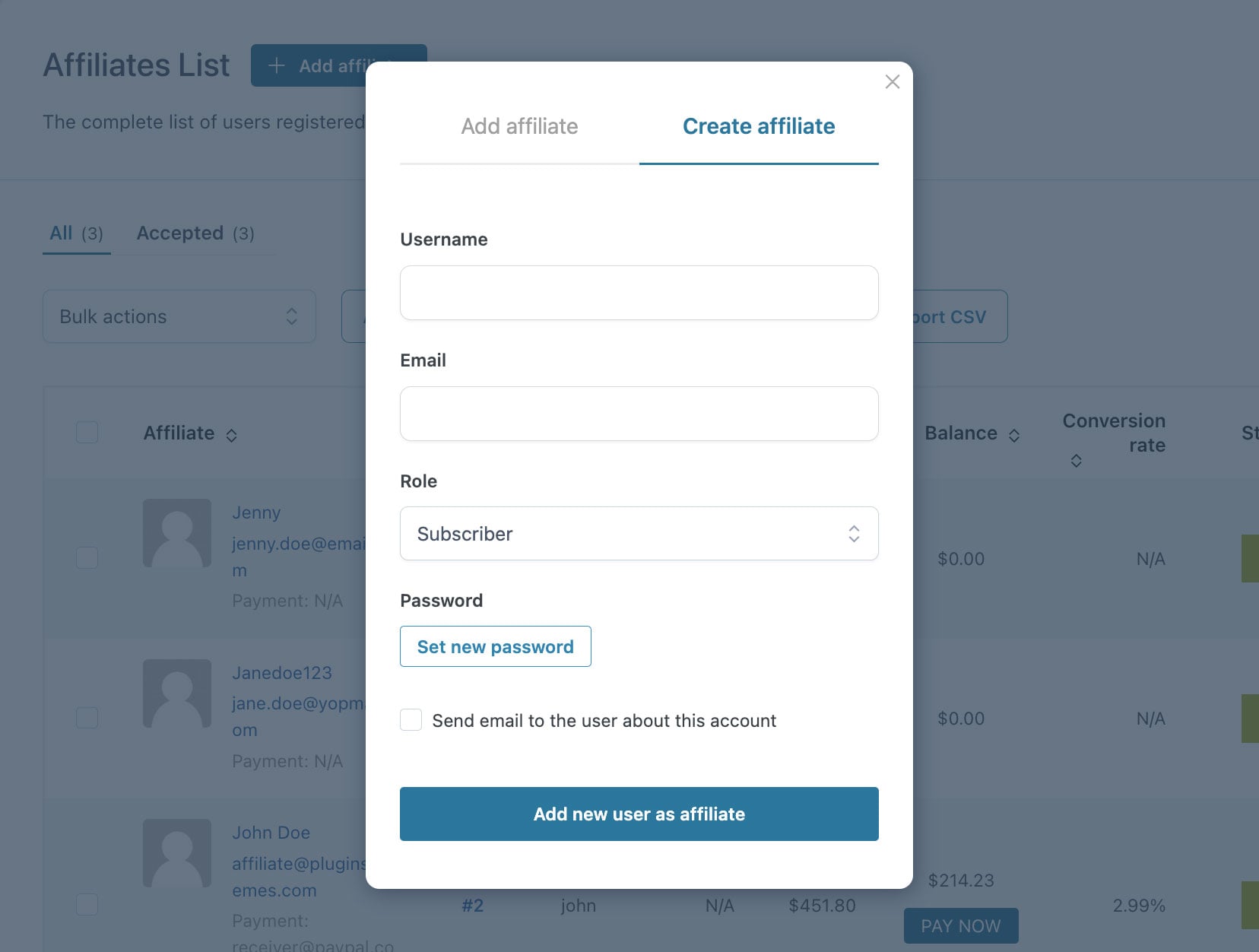 From the Affiliates table, you can manually add new affiliates (choose between registered users or add a new one through the modal window) and also approve or reject the affiliate applications that come through the registration form in your shop. The table will give you a quick overview of the commissions, earnings, and conversion rates of all the affiliates and it will allow you to access a specific affiliate detail page.