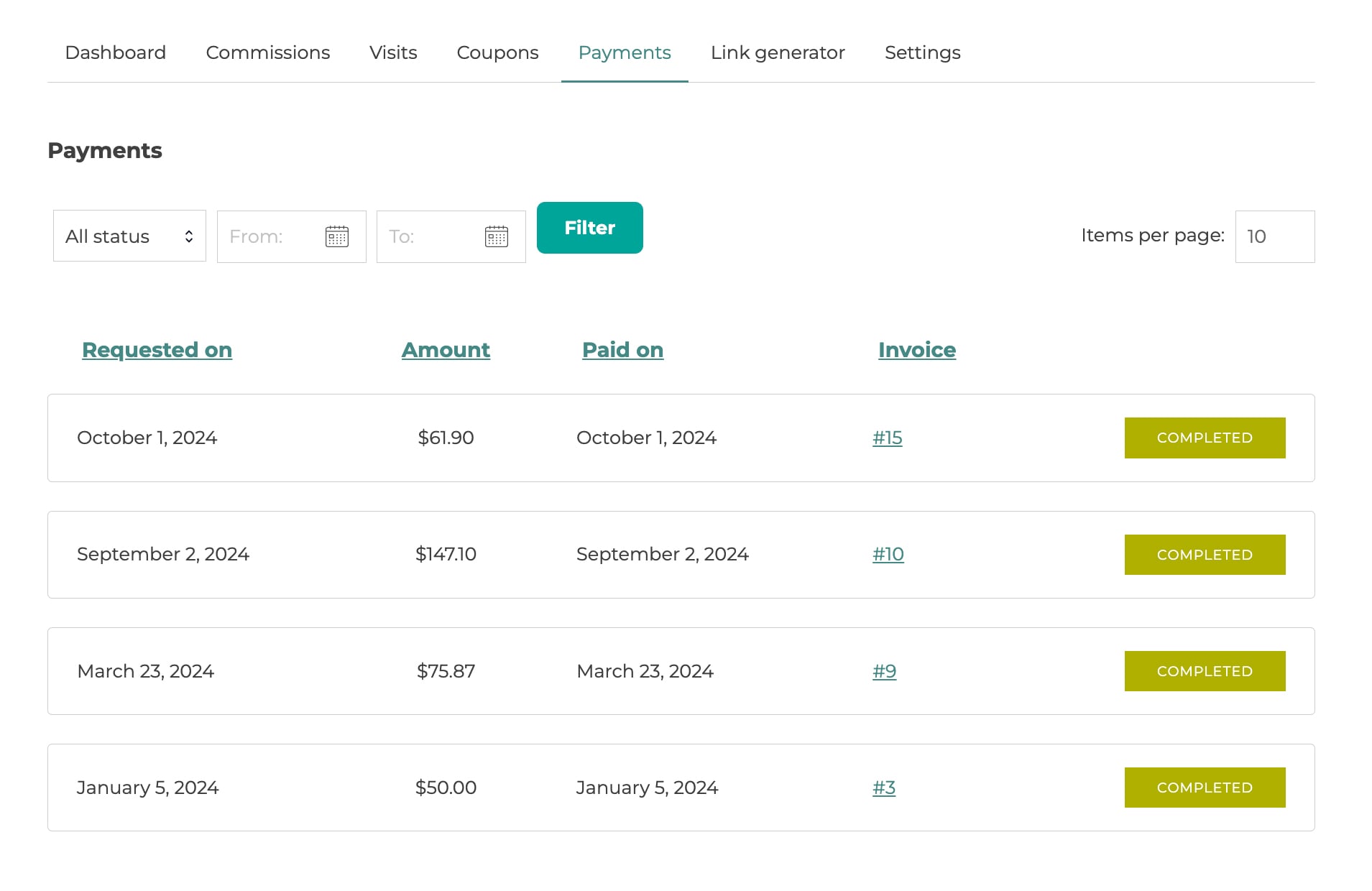 In their dashboard, affiliates can check their commissions and the status of each payment received