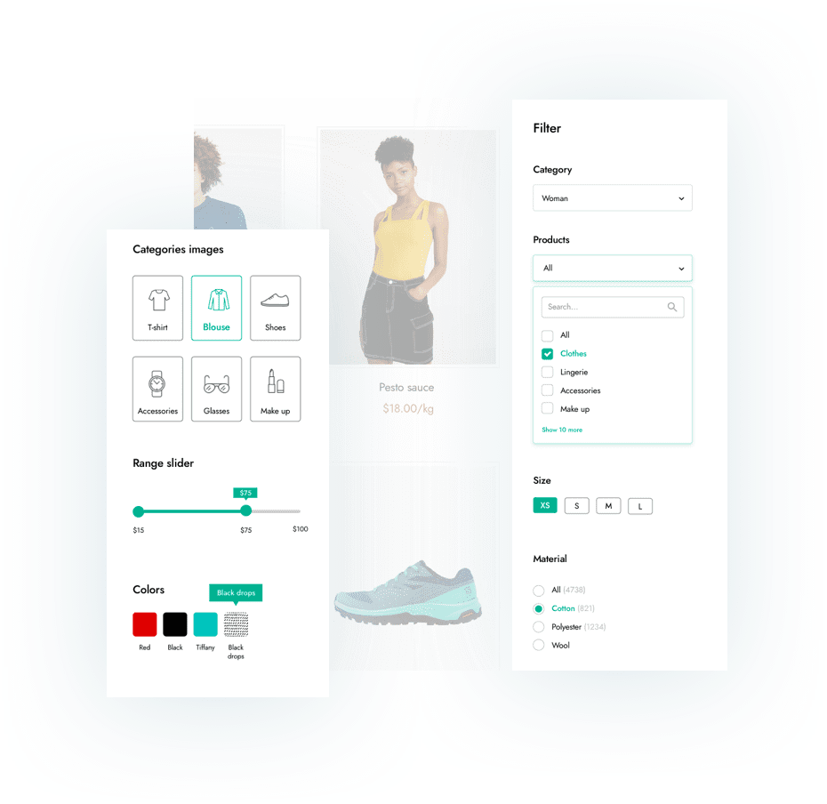 Help your customers to easily find products by filtering for price, size, colors and other custom values.