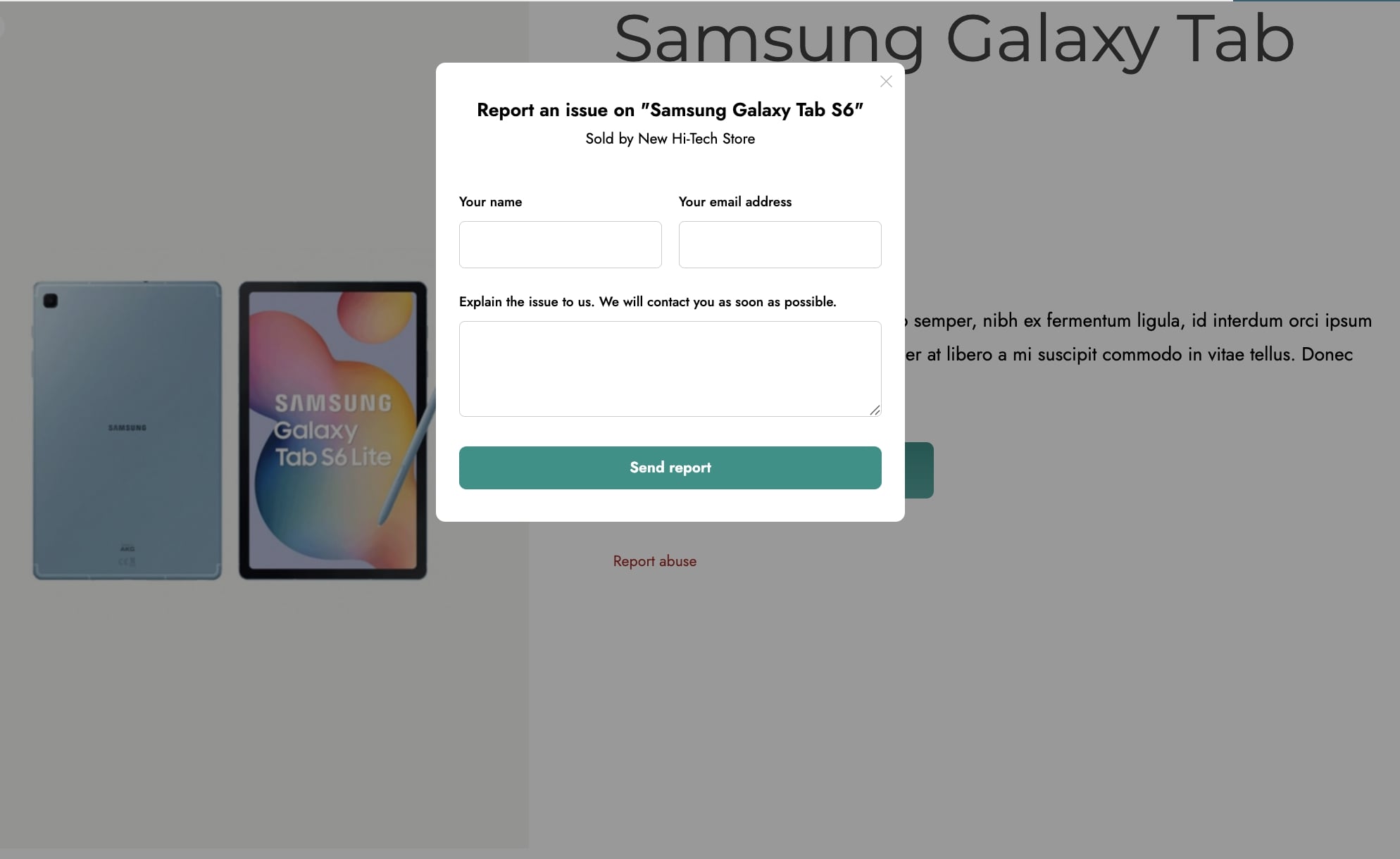 Si activas la opción dedicada, se mostrará un enlace “informar abuso” en cada página de producto para que los usuarios puedan hacer clic en él, agregar sus datos personales y explicar el motivo del informe. Los informes se pueden supervisar fácilmente ya que se guardan en una tabla visible para el administrador en el backend.