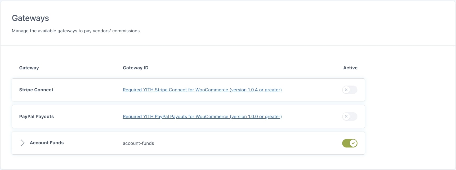 Puedes pagar las comisiones de tus vendedores manualmente (por ejemplo, con transferencias bancarias o emitiendo pagos a través de PayPal) o puedes integrar una pasarela de pago como PayPal Payouts, Stripe Connect o Account Funds para automatizar los desembolsos. Al instalar cualquiera de estos plugins, también puedes acreditar automáticamente las comisiones durante el proceso de pago, por lo tanto, cuando el pedido se pague y se complete, las comisiones de los vendedores se pagarán automáticamente, en tiempo real.