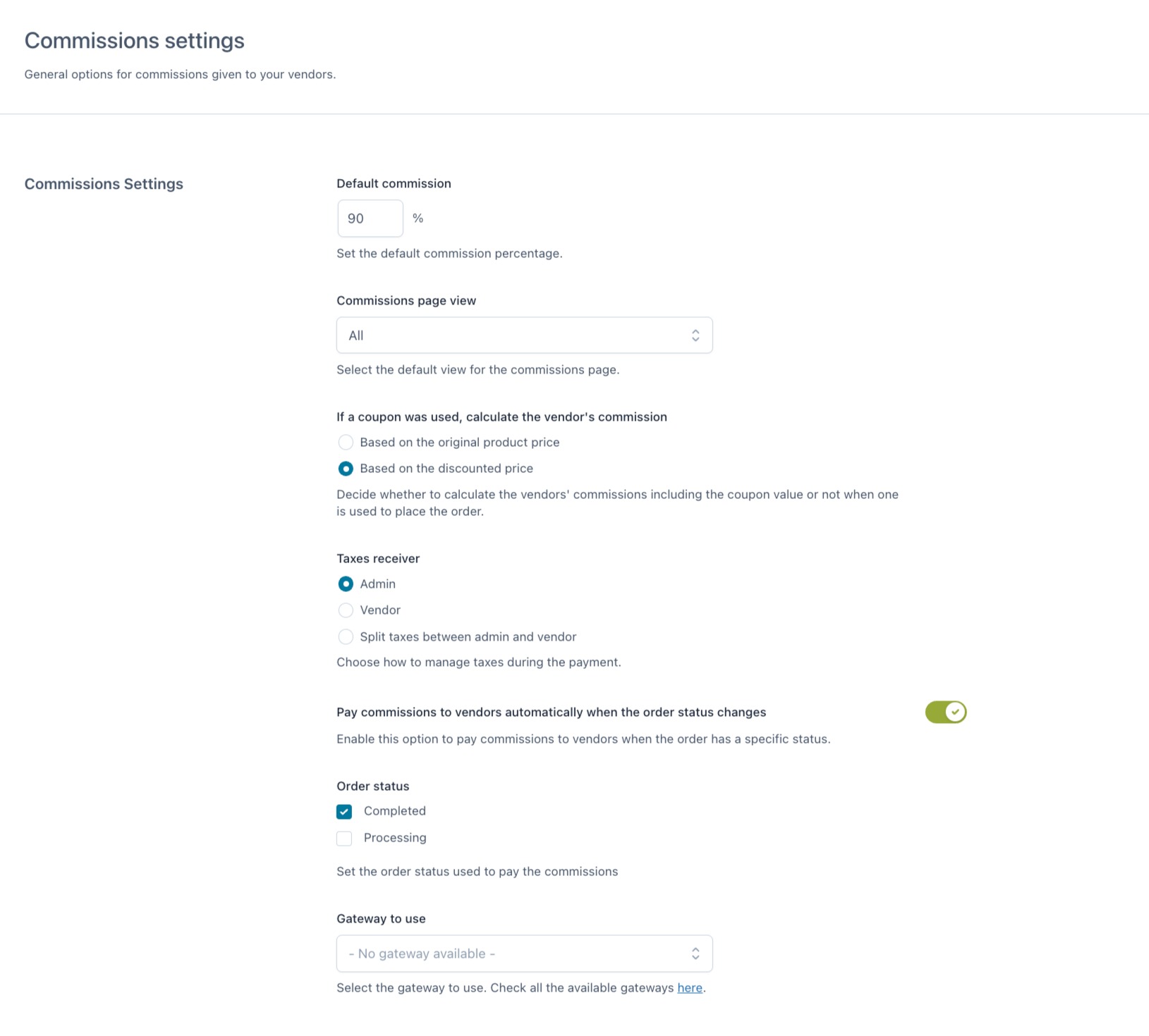 Establece una tasa de comisión global para todos tus vendedores y elige si deseas calcular la comisión a partir del precio normal del producto o del precio rebajado. También puedes decidir quién pagará los impuestos (el administrador o el vendedor) y anular la tasa de comisión global al establecer una nueva tasa para vendedores específicos.