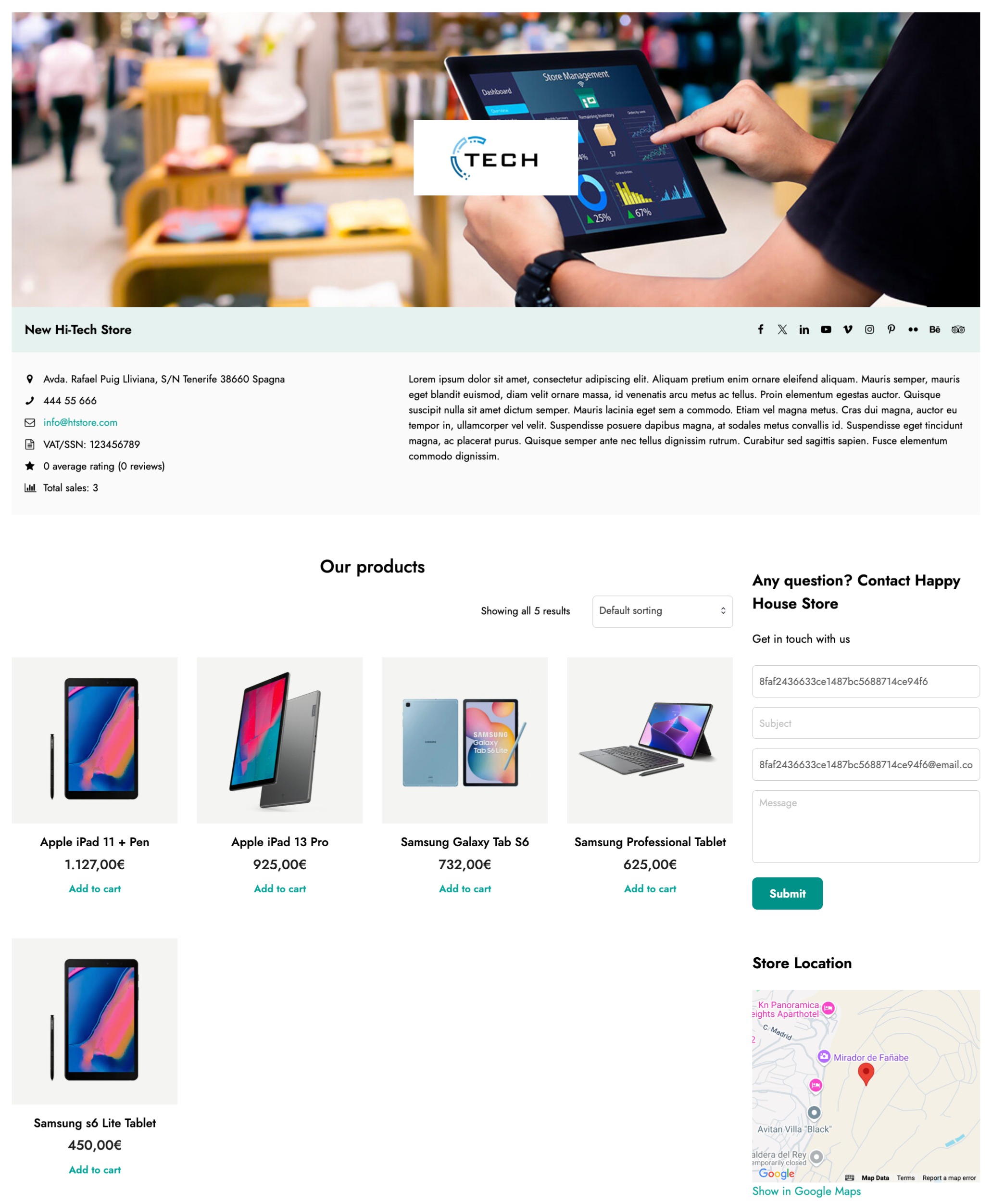 El plugin incluye tres diseños diferentes para la página de la tienda del vendedor: elige el que mejor se adapte al estilo de tu tienda y personaliza los colores, el tamaño del logotipo y la imagen de cabecera, los detalles del vendedor para mostrar y mucho más.