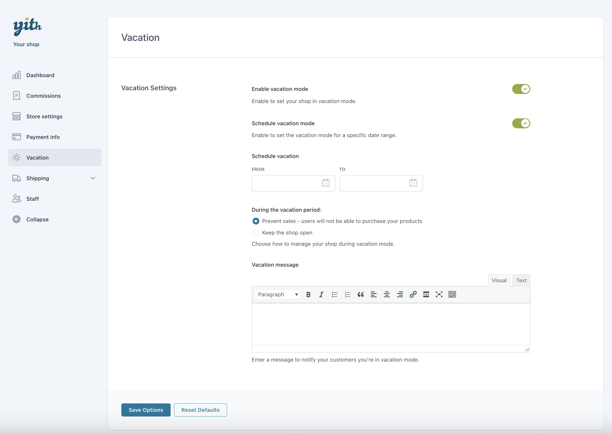 Gracias al módulo integrado llamado “vacaciones del vendedor”, cada vendedor podrá cerrar temporalmente su propia tienda y mostrar un aviso para informar a los clientes sobre el motivo, la fecha de reapertura y más. Los vendedores también pueden elegir si seguir vendiendo sus productos mientras la tienda esté cerrada o detener las ventas y evitar que los clientes compren productos mientras tanto.