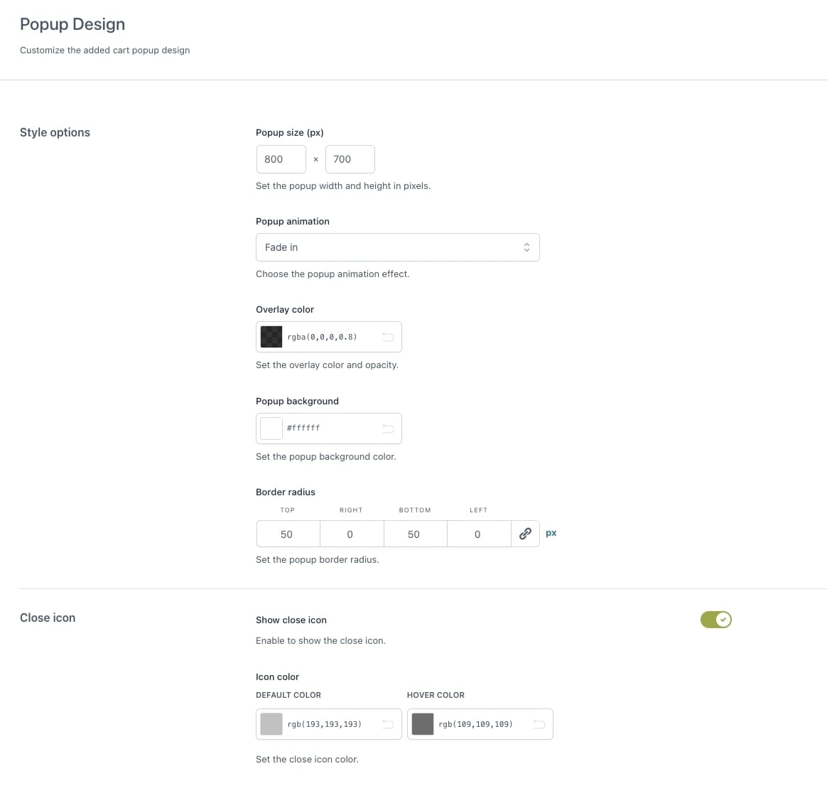 From overlay color to popup background, border radius, text color, sizes, and animation effect, you can customize every aspect of your popup and adapt it to your needs and your store’s look.
