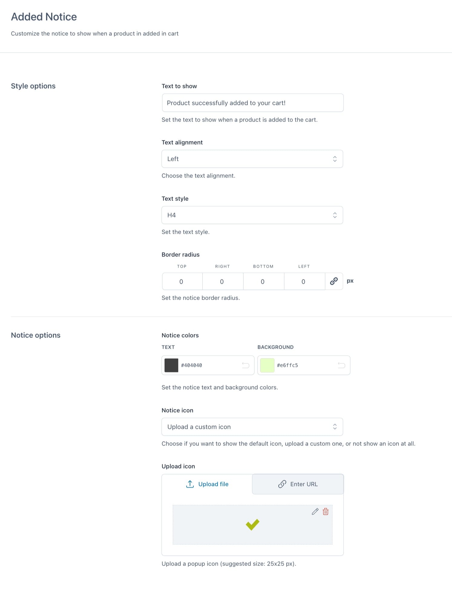 • Customize the “Added to cart” notice (text, icon, colors, etc.)